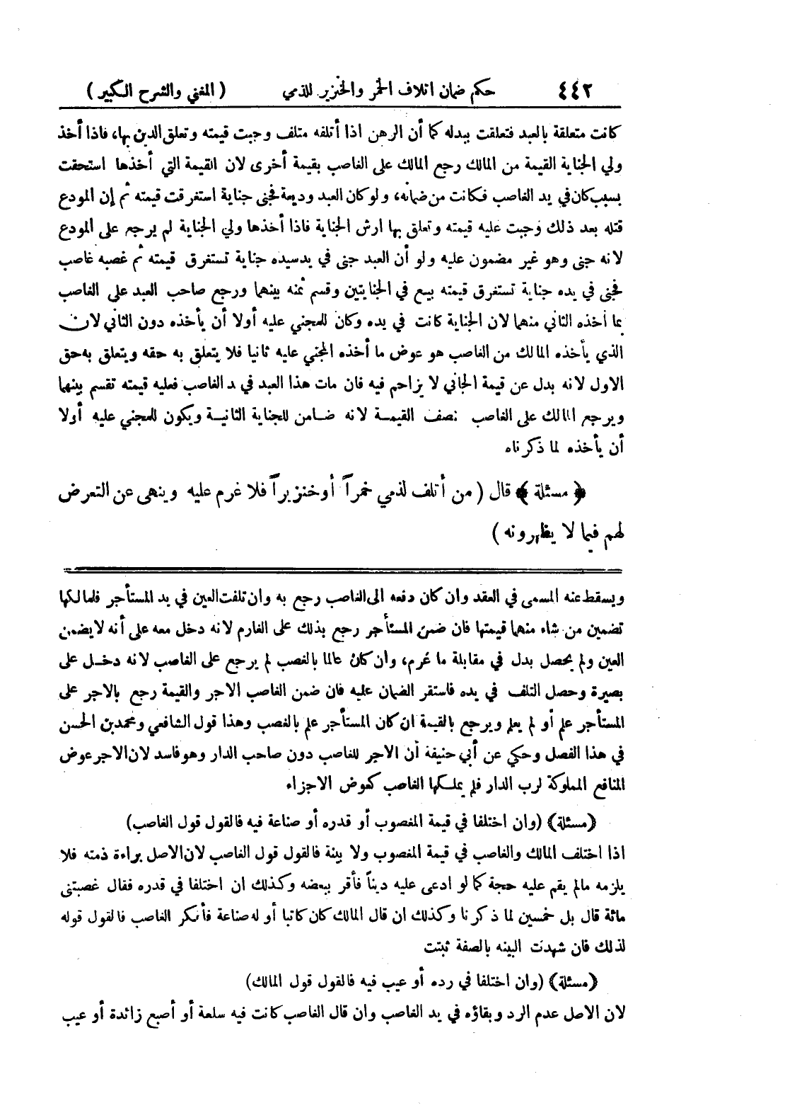 ويسقط عنه في العقد وإن كان دفعه إلى الغاصب رجع به وإن تلفت العين في يد المستأجر فلمالكها تضمين من شاء منهما قيمتها فإن ضمن المستأجر رجع بذلك على الغارم لأنه دخل معه على أنه لا يضمن العين ولم يحصل بدل في مقابلة ما غرم، وإن كان عالماً بالغصب لم يرجع على الغاصب لأنه دخل على بصيرة وحصل التلف في يده فاستقر الضمان عليه فإن ضمن الغاصب الأجر والقيمة رجع بالاجر على المستأجر علم أو لم يعلم ويرجع بالقيمة إن كان المستأجر علم بالغصب وهذا قول الشافعي ومحمد بن الحسن في هذا الفصل وحكي عن أبي حنيفة أن الأجر اللغاصب دون صاحب الدار وهو فاسد لأن الأجر عوض المنافع المملوكة لرب الدار فلم يملكها الغاصب كعوض الاجزاء (مسألة) (وإن اختلفا في قيمة المغصوب أو قدره أو صناعة فيه فالقول قول الغاصب)