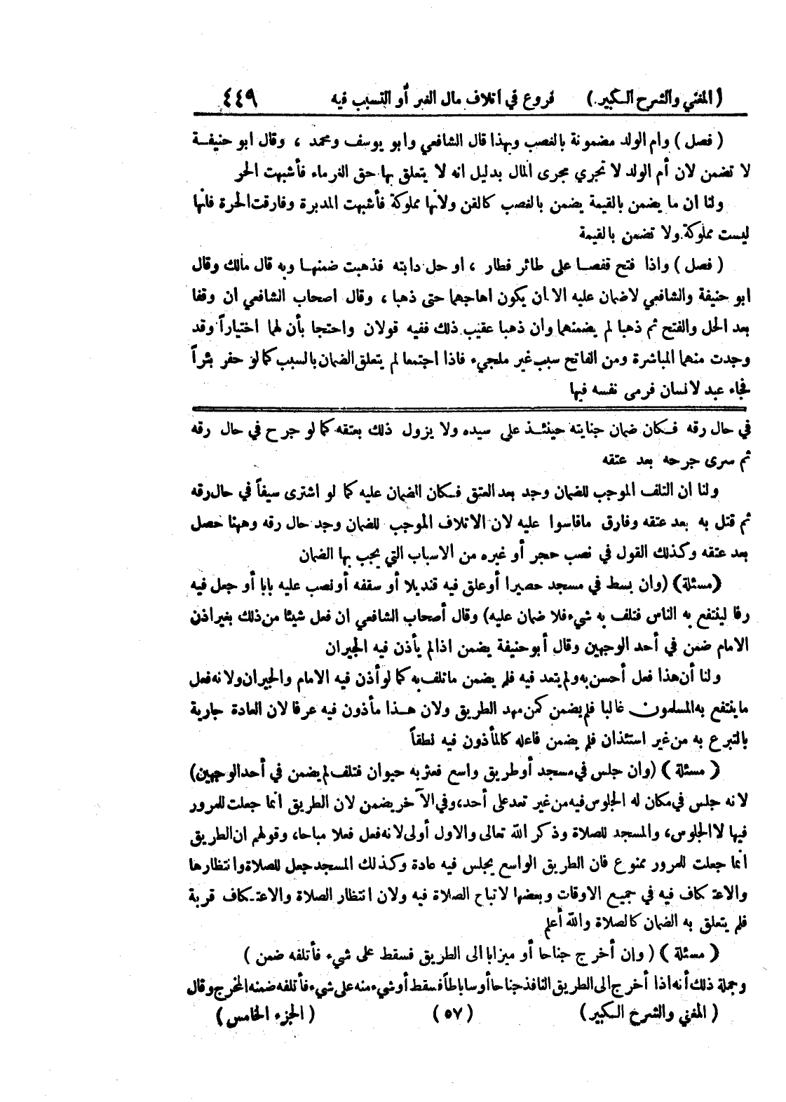 في حال رقه فكان ضمان جنايته حيئنذ على سيده ولا يزال ذلك بعتقه كما لو جرح في حال رقه ثم سرى جرحه بعد عتقه ولنا أن التلف الموجب للضمان وجد بعد العتق فكان الضمان عليه كما لو اشترى سيفاً في حال رقه ثم قتل به بعد عتقه وفارق ما قاسوا عليه لأن الإتلاف الموجب للضمان وجد حال رقه وههنا حصل بعد عتقه وكذلك القول في نصيب حجر أو غيره من الأسباب التي يجب بها الضمان (مسألة) (وإن بسط في مسجد حصيراً أو علق فيه قنديلاً أو سقفه أو نصب عليه باباً أو جعل فيه رقا لينتفع به الناس فتلف به شئ فلا ضمان عليه) وقال أصحاب الشافعي إن فعل شيئاً من ذلك بغير إذن الإمام ضمن في أحد الوجهين وقال أبو حنيفة يضمن اذالم يأذن فيه الجيران ولنا أن هذا فعل أحسن به ولم يتعد فيه فلم يضمن ما تلف به كما لو أذن فيه الإمام والجيران ولأنه فعل ما يتنفع به المسلمون غالباً فلم يضمن كمن مهد الطريق ولأن هذا مأذون فيه عرفاً لأن العادة جارية بالتبرع به من غير استئذان فلم يضمن فاعله كالمأذون فيه نطلقا (مسألة) (وإن جلس في مسجد أو طريق واسع فعثر به حيوان فتلف لم يضمن في أحد الوجهين) لأنه جلس في مكان له الجلوس فيه من غير تعد على أحد، وفي الآخر يضمن لأن الطريق إنما جعلت للمرور فيها لا الجلوس، والمسجد للصلاة وذكر الله تعالى والأول أولى لأنه فعل فلا مباحاً، وقولهم أن الطريق إنما جعلت للمرور ممنوع فإن الطريق الواسع يجلس فيه عادة وكذلك المسجد جعل للصلاة وإنتظارها والإعتكاف فيه في جميع الأوقات وبعضها لا تباح الصلاة فيه ولأن انتظار الصلاة والإعتكاف قربة فلم يتعلق به الضمان كالصلاة والله أعلم