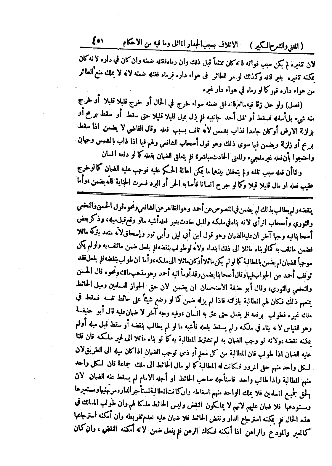 ينقضه ولم يطالب بذلك لم يضمن في المنصوص عن أحمد وهو الظاهر عن الشافعي ونحوه قول الحسن والنخعي والثوري وأصحاب الررأي لأنه بناه في ملكه والميل حادث بغير فعله أشبه مالو وقع ميله، وذكر بعض أصحابنا فيه وجهاً آخر أن عليه الضمان وهو قول ابن أبي ليلى وأبي ثور وإسحاق لأنه متعد بتركه مائلاً فضمن ما تلف به كما لو بناه مائلاً إلى ذلك إبتداء ولانه لو طولب بنقضه فلم يفعل ضمن ما تلف به ولو لم يكن موجباً للضمان لم يضمن بالمطالبة كما لو لم يكن مائلا أو كان مائلاً إلى ملكه، وأما إن طولب بنقضه فلم يفعل فقد توقف أحمد عن الجواب فيها وقال أصحابنا يضمن وقد أومأ إليه أحمد وهو مذهب مالك ونحو قال الحسن والنخعي والثوري، وقال أبو حنيفة الإستحسان أن يضمن لأن حق الجواز للمسلمين وميل الحائط يمنعهم ذلك فكان لهم المطالبة بإزالته فإذا لم يزله ضمن كما لو وضع شيئاً على حائط نفسه فسقط في ملك غيره فطولب برفعه فلم يفعل حتى عثر به إنسان، وفيه وجه آخر لا ضمان عليه قال أبو حنيفة وهو القياس لأنه بناه في ملكه ولم يسقط بفعله فأشبه مالو لم يطالب بنقضه أو سقط قبل ميله أولم يمكنه نقضه، ولأنه لو وجب الضمان به لم تشترط المطالبة به كما لو بناه مائلاً إلى غير ملكه فإن قلنا عليه الضمان إذا طولب فإن المطالبة من كل مسلم أو ذمي توجب المضان إذا كان ميله إلى الطريق لأن لكل واحد منهم حق المرور فكانت له المطالبة كما لو مال الحائط إلى ملك جماعة فإن لكل واحد منهم المطالبة وإذا طالب واحد فاستأجله صاحب الحائط أو أجله الإمام لم يسقط عنه الضمان لأن الحق لجميع المسلمين فلا يملك الواحد منهم إسقاطه وإن كانت المطالبة لمستأجر الدار ومرتهنيها ومستعيرها ومستودعها فلا ضمان عليهم لأنهم لا يملكون القبض وليس الحائط ملكها لهم وإن طولب المالك في هذه الحال فلم يمكنه استرجاع الدار ونقض الحائط فلا ضمان عليه لعدم تفريطه وإن أمكنه استرجاعها كالمعير والمودع والراهن إذا أمكنه فكاك الرهن فم يفعل ضمن لأنه أمكنه النقض، وإن كان