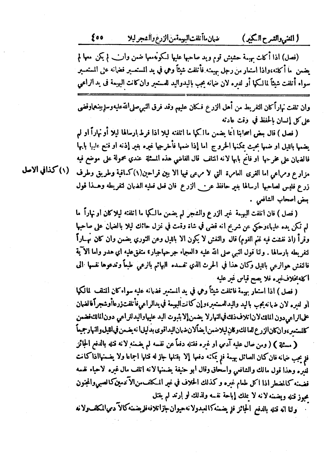 وإن تلفت نهاراً كان التفريط من أهل الزرع فكان عليهم وقد فرق النبي صلى الله عليه وسلم بينهما وقضى على كل إنسان بالحفظ في وقت عادته فصل) قال بعض أصحابنا انما يضمن مالكها ما أتلفته ليلاً إذا فرط بإرسالها ليلاً أنهارا اولم