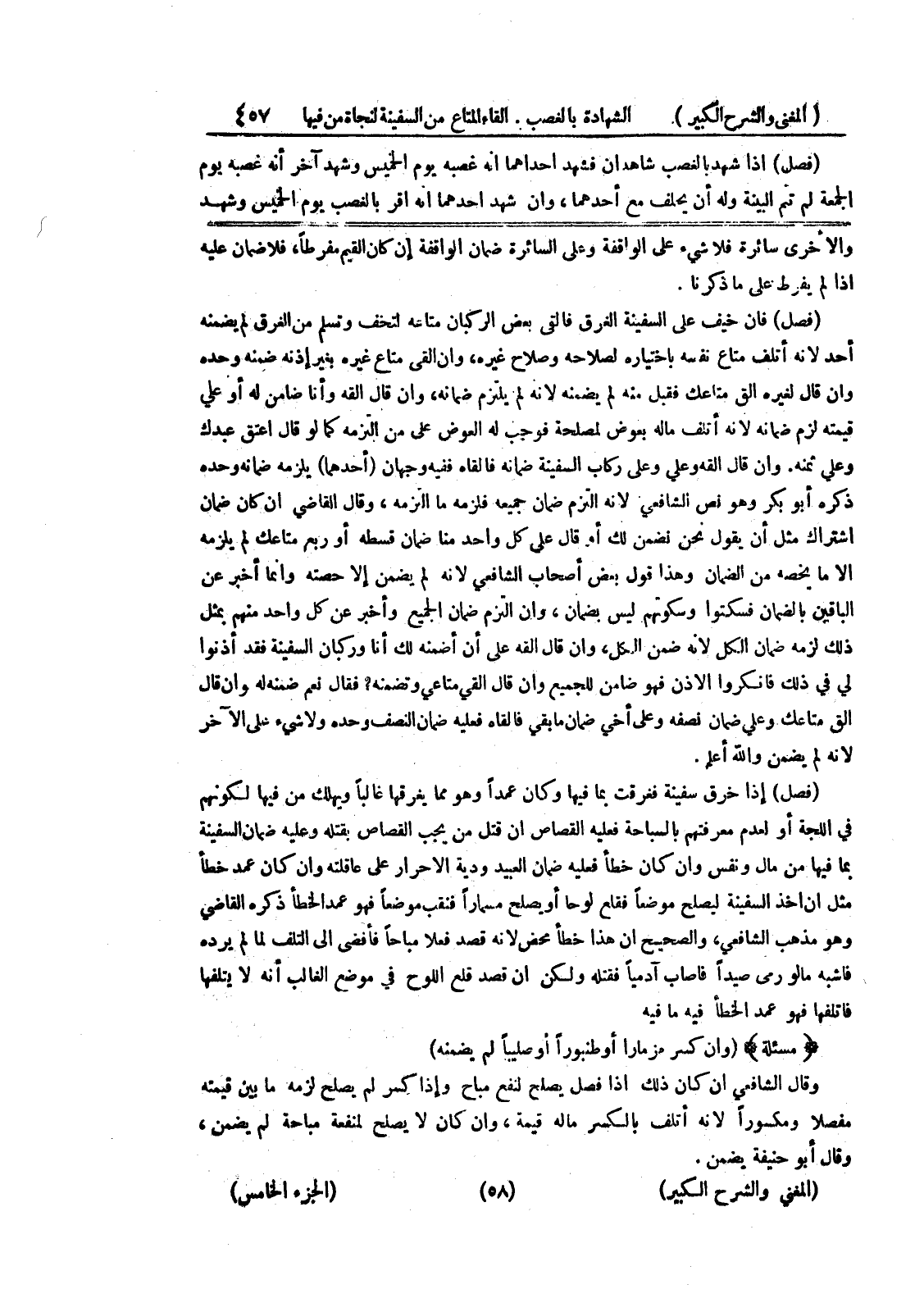 (فصل) فإن خيف على السفينة الغرق فألقى بعض الركبان متاعه لتخف وتسلم من الغرق لم يضمنه أحد لأنه أتلف متاع نفسه بأختياره لصلاحه وصلاح غيره، وإن ألقى متاع غيره بغير إذنه ضمنه وحده وإن قال لغيره إلق متاعك فقبل منه لم يضمنه لأنه لم يلتزم ضمانه، وإن قال إلقه وأنا ضامن له أو علي قيمته لزم ضمانه لأنه أتلف ماله بعوض لمصحلة فوجب له العوض على من التزمه كما لو قال أعتق عبدك وعلي ثمنه.
