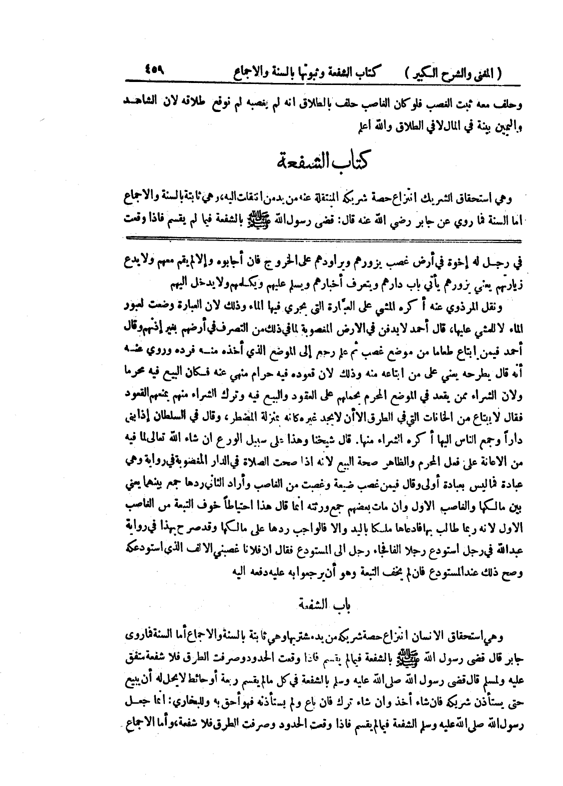قال شيخنا وهذا على سيبل الورع إن شاء الله تعالى لما فيه من الإعانة على فعل المحرم والظاهر صحة البيع لأنه إذا صحت الصلاة في الدار المغصوبة في رواية وهي عبادة فما ليس بعبادة أولى وقال فيمن غصب ضيعه وغصبت من الغاصب وأراد الثاني ردها جمع بينهما يعني بين مالكها والغاصب الأول وإن مات بعضهم جمع ورثته إنما قال هذا احتياطاً خوف التبعة من الغاصب الأول لأنه ربما طالب ربها فادعاها ملسكا باليد وإلا فالواجب ردها على مالكها وقد صرح بهذا في رواية عبد الله في رجل استودع رجلاً ألفاً فجاء رجل إلى المستودع فقال إن فلاناً غصبني الألف الذي استودعكه وصح ذلك عند المستودع فإن لم يخف التبعة وهو أن يرجعوا به عليه دفعه إليه باب الشفعة وهي استحقاق الإنسان إنتزاع حصة شريكه من يد مشتريها وهي ثابتة بالسنة والإجماع أما السنة فما روى جابر قال قضى رسول الله صلى الله عليه وسلم بالشفعة فيما لم يقسم فإذا وقعت الحدود وصرفت الطرق فلا شفعة متفق عليه ولمسلم قال قضى رسول الله صلى الله عليه وسلم بالشفعة في كل ما لم يقسم ربعة أو حائط لا يحل له أن يبيع حتى يستأذن شريكه فإن شاء أخذ وإن شاء ترك فإن باع ولم يستأذنه فهو أحق به وللبخاري: إنما جعل رسول الله صلى الله عليه وسلم الشفعة فيما لم يقسم فإذا وقعت الحدود وصرفت الطرق فلا شفعة، وأما الإجماع