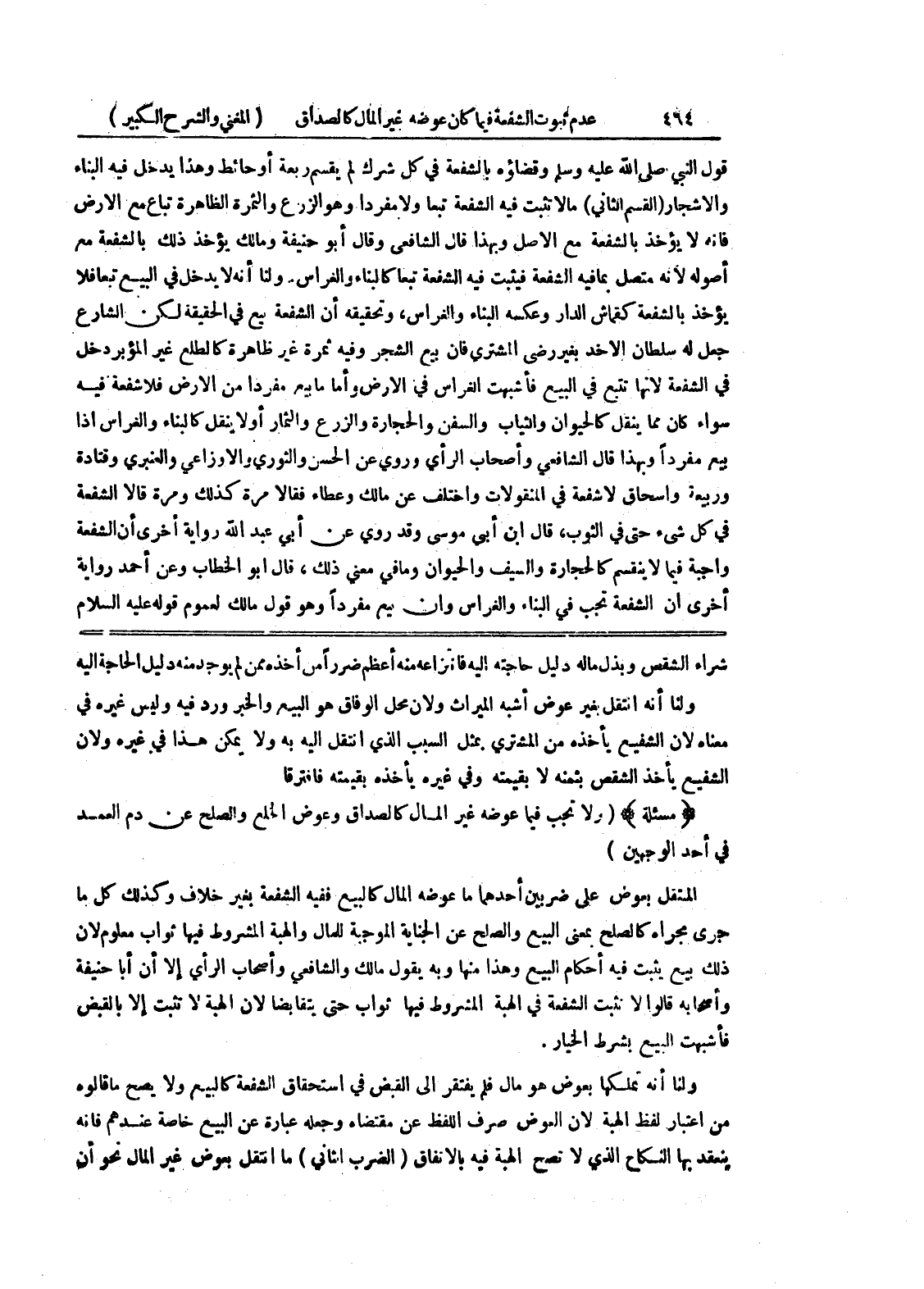 شراء الشقص وبذل ماله دليل حاجته إليه فانتزاعه منه أعظم ضرراً من أخذه ممن لم يوجد منه دليل الحاجة إليه ولنا أنه انتقل بغير عوض أشبه الميراث ولأن محل الوفاق هو البيع والخبر ورد فيه وليس غيره في معناه لأن الشفيع يأخذه ومن المشتري بمثل السبب الذي انتقل اليه به ولا يمكن هذا في غيره ولأن الشفيع يأخذ الشقص بثمنه لا يقيمته وفي غيره يأخذه بقيمته فافترقا (مسألة) (ولا تجب فيما عوضه غير المال كالصداق وعوض الخلع والصلح عن دم العمد في أحد الوجهين) والمستقل بعوض على ضربين أحدهما ما عوضه المال كالبيع ففيه الشفعة بغير خلاف وكذلك كل ما جرى مجراه كالصلح بمعنى البيع والصلح عن الجناية الموجبة للمال والهبة والمشروط فيها ثواب معلوم لأن ذلك بيع يثبت فيه أحكام البيع وهذا منها وبه يقول مالك والشافعي وأصحاب الرأي إلا أن أبا حنيفة وأصحابه قالوا لا تثبت الشفعة في الهبة المشروط فيها ثواب حتى يتقابضا لأن الهبة لا تثبت إلا بالقبض فأشبهت البيع بشرط الخيار.