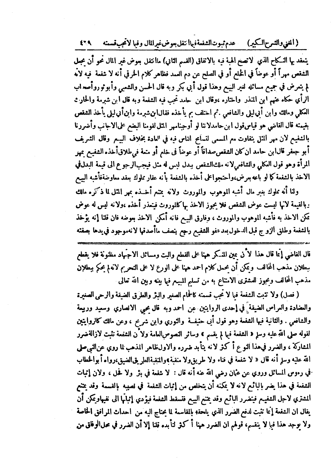 والثانية فيها الشفعة وهو قول أبي حنيفة والثوري وابن شريح، وعن مالك كالروايتين لقوله صلى الله عليه وسلم (الشفعة فيما لم يقسم) وسائر النصوص العامة ولأن الشفعة تثبت لإزالة ضرر المشاركة، والضرر في هذا النوع أكثر لأنه يتأبد ضرره والأول ظاهر المذهب لما روي عن النبي صلى الله عليه وسلم أنه قال (لا شفعة في فناء ولا طريق ولا منقبة) والمقنبة الطريق الضيق، رواه أبو الخطاب في رءوس المسائل وروي عن عثمان رضي الله عنه أنه قال: لا شفعة في بئر ولا فحل، ولأن إثبات الشفعة في هذا يضر بالبائع لأنه لا يمكنه أن يتخلص من إثبات الشفعة في نصيبه بالقسمة وقد يمتنع المشتري لأجل الشفيع فيتضرر البائع وقد يمتنع البيع فتسقط الشفعة فيؤدي إثباتها إلى نفيها ويمكن أن يقال أن الشفعة إنما تثبت لدفع الضرر الذي يلحقه بالمقاسمة لما يحتاج إليه من إحداث المرافق الخاصة ولا يوجد هذا فيما لا ينقسم، قولهم أن الضرر ههنا أكثر لتأبده قلنا إلا أن الضرر في محل الوفاق من