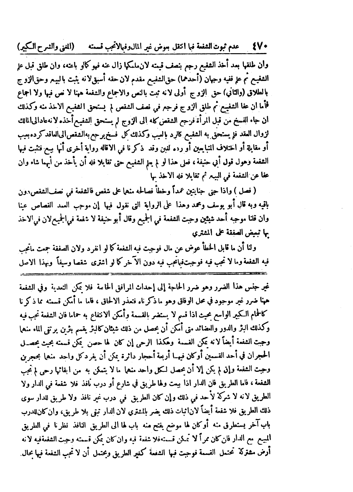 غير جنس هذا الضررو هو ضرر الحاجة إلى إحداث المرافق الخاصة فلا يمكن التعدية وفي الشفعة ههنا ضرر غير موجود في محل الوفاق وهو ما ذكرناه فتعذر الإلحاق، فأما ما أمكن قسمته مما ذكرنا كالحمام الكبير الواسع بحيث إذا قسم لا يستضر بالقسمة وأمكن الإنتفاع به حماماً فإن الشفعة تجب فيه وكذلك البئر والدور والعضائد متى أمكن أن يحصل من ذلك شيئان كالبئر يقسم بئرين يرتقى الماء منهما وجبت الشفعة أيضاً لأنه يمكن القسمة وهكذا الحرى إن كان لها حصن يمكن قسمته بحيث يحصل الحجران في أحد القسمين أو كان فيها أربعة أحجار دائرة يمكن أن يفرد كل واحد منهما بحجرين وجبت الشفعة وإن لم يكن إلا أن يحصل لكل واحد منهما مالا يتمكن به من إبقائها رحى لم تجب الشفعة فأما الطريق فإن الدار إذا بيعت ولها طريق في شارع أو درب نافذ فلا شفعة في الدار ولا الطريق لأنه لا شركة لأحد في ذلك وإن كان الطريق في درب غير نافذ ولا طريق، للدارسوى ذلك الطريق فلا شعفة أيضاً لأن إثبات ذلك يضر بالمشتري لأن الدار تبقى بلا طريق، وإن كان للدرب باب آخر يستطرق منه أو كان لها موضع يفتح منه باب لها إلى الطريق النافذ نظرنا في الطريق المبيع مع الدار فإن كان ممرا لاتمكن قسمته فلا شفعة فيه وإن كان يمكن قسمته وجبت الشفعة فيه لأنه