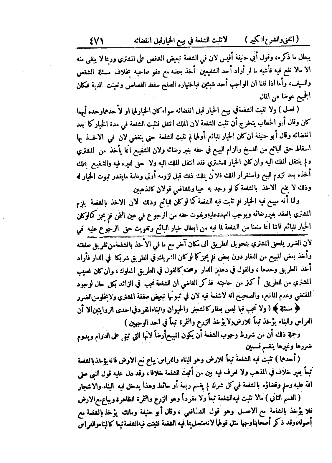 لأن الضرر يلحق المشتري بتحويل الطريق الى مكان آخر مع ما في الأخذ بالشفعة من تفريق صفقته وأخذ بعض المبيع من العقار دون بعض فلم يجزكما لو كان الشريك في الطريق شريكاً في الدار فأراد أخذ الطريق وحدها، والقول في دهليز الدار وصحنه كالقول في الطريق المملوك، وإن كان نصيب المشتري من الطريق أكثر من حاجته فذكر القاضي أن الشفعة تجب في الزائد بكل حال لوجود المقتضي وعدم المانع، والصحيح أنه لا شفعة فيه لأن في ثبوتها تبعيض صفقة المشتري ولا يخلو من الضرر (مسألة) (ولا تجب فيما ليس بعقار كالشجر والحيوان والبناء المفرد في إحدى الروايتين إلا أن الغراس والبناء يؤخذ تبعاً للأرض ولا يؤخذ الزرع والثمرة تبعاً في أحد الوجهين) وجملة ذلك أن من شروط وجوب الشفعة أن يكون المبيع أرضاً لأنها التي تبقى على الدوام ويدوم ضررها وغيرها ينقسم قسمين (أحدهما) تثبت فيه الشفعة تبعاً للأرض وهو البناء والغراس يباع مع الأرض فإنه يؤخذ بالشفعة تبعاً بغير خلاف في المذهب ولا نعرف فيه بين من أثبت الشفعة خلافاً، وقد دل عليه قول النبي صلى الله عليه وسلم وقضاؤه بالشفعة في كل شرك لم يقسم ربعة أو حائط وهذا يدخل فيه البناء والأشجار (القسم الثاني) مالا تثبت فيه الشفعة تبعاً ولا مفرداً وهو الزرع والثمرة الظاهرة ويباع مع الأرض فلا يؤخذ بالشفعة مع الأصل وهو قول الشافعي، وقال أبو حنيفة ومالك يؤخذ بالشفعة مع أصوله، وقد ذكر أصحابنا وجهاً مثل قولهما لأنه متصل بما فيه الشفعة فثبتت فيه الشفعة تبعاً كالبناء والغراس