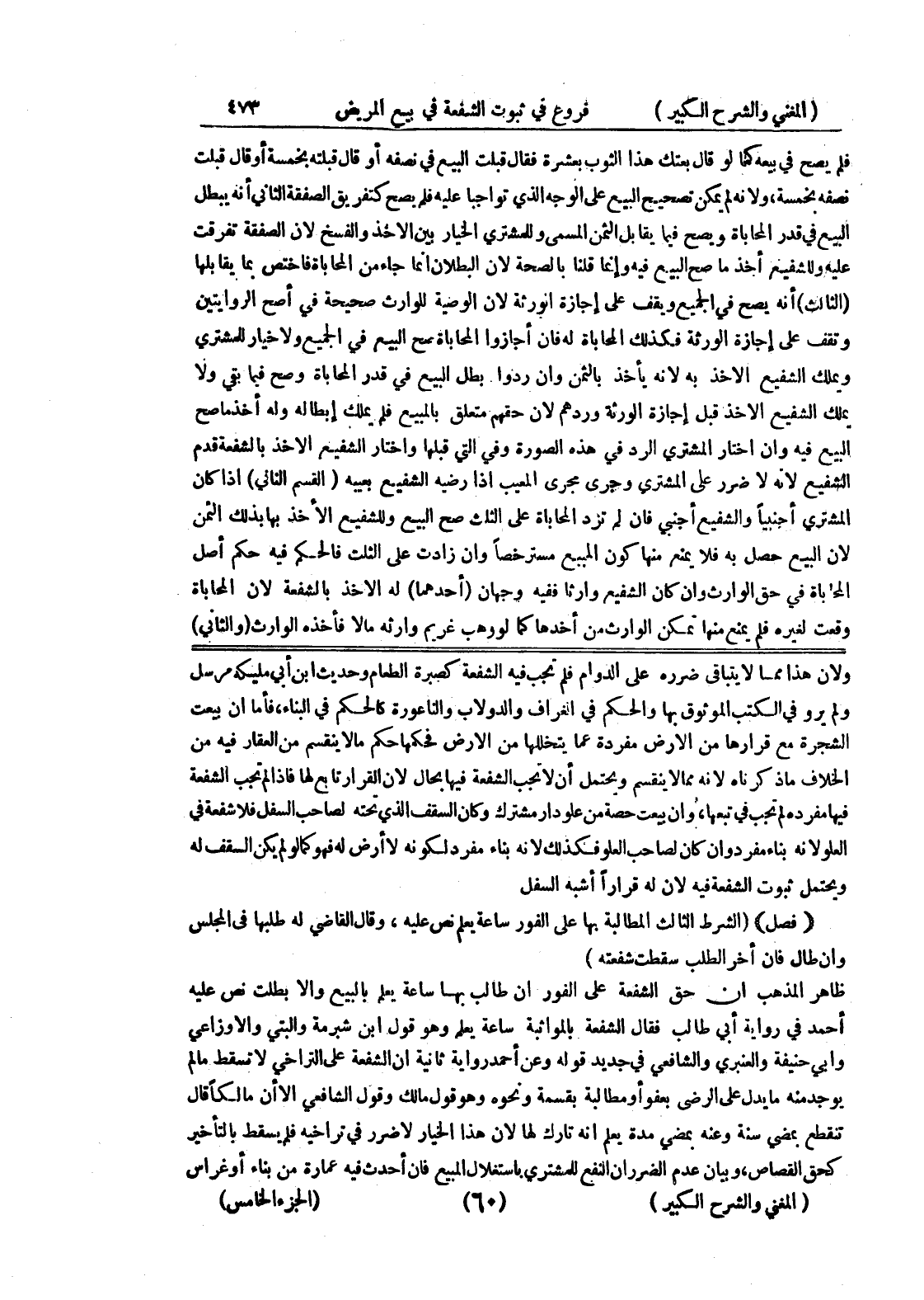 ولأن هذا مما لا ينافى ضرره على الدوام فلم تجب فيه الشفعة كصبرة الطعام وحديث ابن أبي مليكة مرسل ولم يرو في الكتب الموثوق بها والحكم في الغراف والدولاب والناعورة كالحكم في البناء، فأما إن بيعت الشجرة مع قرارها من الأرض مفردة عما يتخلها من الأرض فحكمها حكم مالا ينقسم من العقار فيه من الخلاف ما ذكرناه لأنه مما لا ينقسم ويحتمل أن لا تجب الشفعة فيها بحال لأن القرار تابع لها فإذا لم تجب الشفعة فيها مفردة لم تجب في تبعها وإن بيعت حصة من علودار مشترك وكان السقف الذي تحته لصاحب السفل فلا شفعة في العلو لأنه بناء مفردوان كان لصاحب العلو فكذلك لأنه بناء مفرد لانه لا ارض له فهو كما لو لم يكن السقف له ويحتمل ثبوت الشفعة فيه لأن له قراراً أشبه السفل (فصل) الشرط الثالث المطالبة بها على الفور ساعة يعلم نص عليه، وقال القاضي له طلبها في المجلس وإن طال فإن أخر الطلب سقطت شفعته) ظاهر المذهب أن حق الشفعة على الفور إن طالب بها ساعة يعلم بالبيع والابطلت نص عليه أحمد في رواية أبي طالب فقال الشفعة بالمواثبة ساعة يعلم وهو قول ابن شبرمة والبتي والاوزاعي وابي حنيفة والعنبري والشافعي في جديد قوله وعن أحمد رواية ثانية أن الشفعة على التراخي لا تسقط ما لم