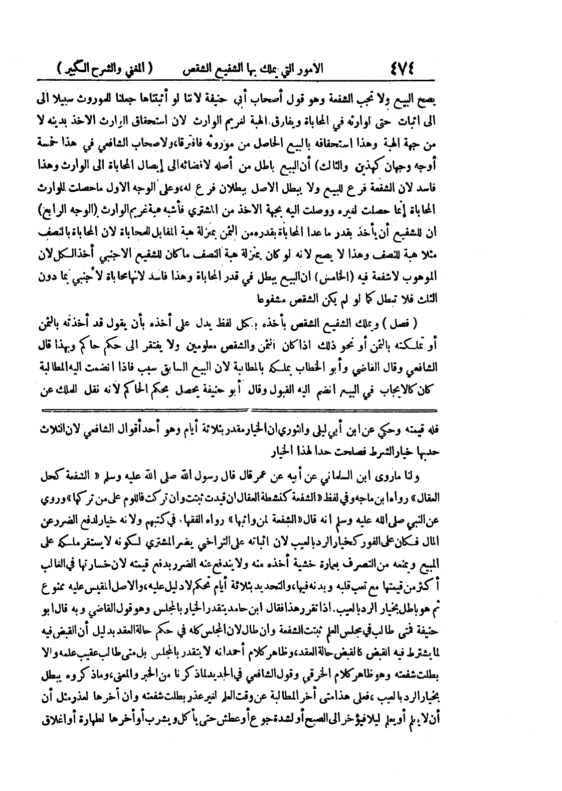 فله قيمته وحكي عن ابن أبي ليلى والثوري أن الخيار مقدر بثلاثة أيام وهو أحد أقوال الشافعي لأن الثلاث حدبها خيار الشرط فصلحت حداً لهذا الخيار ولنا ماروى ابن السلماني عن أبيه عن عمر قال قال رسول الله صلى الله عليه وسلم (الشفعة كحل العقال) رواه ابن ماجه وفي لفظ (الشفعة كنشطة العقال قيدت ثبت وإن تركت فاللوم على من تركها) وروي عن النبي صلى الله عليه وسلم أنه قال ((الشفعة لمن واثبها) رواه الفقهاء في كتبهم ولأنه خيار لدفع الضرر عن المال فكان على الفور كخيار الرد بالعيب لأن إثباته على التراخي يضر المشتري لكونه لا يستقر ملكه على المبيع ويمنعه من التصرف بعمارة خشية أخذه منه ولا يندفع عنه الضرر بدفع قيمته لأن خسارتها في الغالب أكثر من قيمتها مع تعب قبله وبدنه فيها، والتحديد بثلاثة أيام تحكم لا دليل عليه، والأصل المقيس عليه ممنوع ثم هو باطل بخيار الرد العيب.
