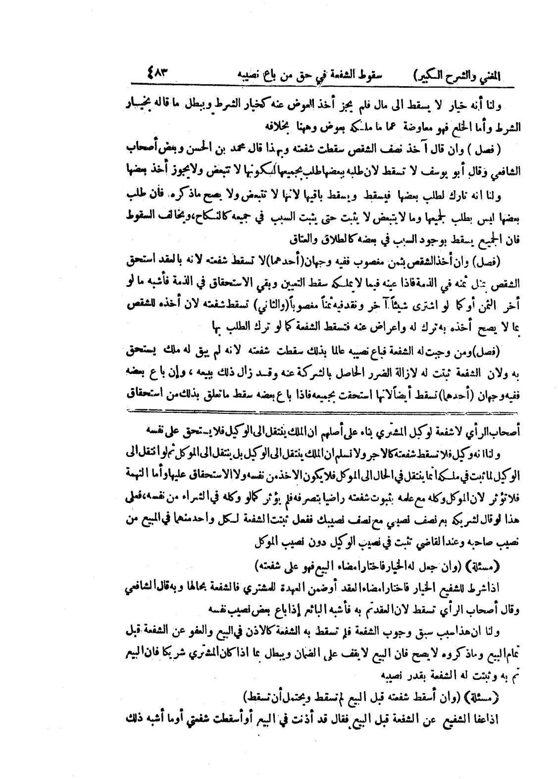 أصحاب الرأى لاشفعة لوكيل المشتري بناء على أصلهم أن الملك ينتقل إلى الوكيل فلا يستحق على نفسه ولنا أنه وكيل فلا تسقط شفعته كالأجر ولا نسلم أن الملك ينتقل إلى الوكيل بل ينتقل إلى الموكل ثم لو انتقل إلى الوكيل لما ثبت في ملكه إنما ينتقل في الحال إلى الموكل فلا يكون الأخذ من نفسه ولا الا ستحقاق عليها وأم التهمة فلا تؤثر لأن الموكل وكله من علمه بثبوت شفعه راضياً بتصرفه فلم يؤثر كما لو وكله في الشراء من نفسه، وفعلى هذا لو قال لشريكه بع نصف نصبي مع نصف نصيبك ففعل ثبتت الشفعة لكل واحد منهما في المبيع من نصيب صاحبه وعند القاضي تثبت في نصيب الوكيل دون نصيب الموكل (مسألة) (وإن جعل له الخيار فاختار إمضاء البيع فهو على شفعته) إذا شرط للشفيع الخيار فاختار امضاء العقد أو ضمن العهدة للمشتري فالشفعة بحالها وبه قال الشافعي وقال أصحاب الرأي تسقط لأن العقد تم به فأشبه البائع إذا باع بعض نصيب نفسه ولنا أن هذا سبب سبق وجوب الشفعة فلم تسقط به الشفعة كالإذن في البيع والعفو عن الشفعة قبل تمام البيع وما ذكروه لا يصح فإن البيع لا يقف على الضمان ويبطل بما إذا كان المشتري شريكاً فإن البيع تم به وثبتت له الشفعة بقدر نصيبه (مسألة) (وإن أسقط شفعته قبل البيع لم تسقط ويحتمل أن تسقط) ادا عفا الشفيع عن الشفعة قبل البيع فقال قد أذنت في البيع أو أسقطت شفعتي أو ما أشبه ذلك