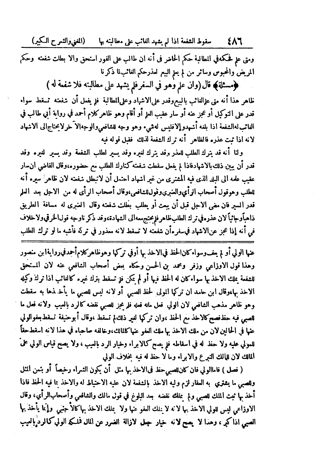 عنها الولي أولم يعف وسواء كان الخط في الأخذ بها أو في تركها وهو ظاهر كلام أحمد في رواية ابن منصور وهذا قول الأوزاعي وزفر ومحمد بن الحسن وحكاه بعض أصحاب الشافعي عنه لأن المستحق للشفعة يملك الأخذ بها سواء كان له الحظ فيها أولم يمكن فلم تسقط بترك غيره كالغائب إذا ترك وكيله الأخذ بها، وقال ابن حامدا تركها المولى لحظ الصبي أو لأنه ليس للصبي ما يأخذها به سقطت وهو ظاهر مذهب الشافعي لأن الولي فعل ماله فعله فلم يجز للصبي نقضه كالرد العيب ولأنه فعل ما للصبي فيه حظ فصح كالأخذ مع الحظ، وإن تركها لغير ذلك لم تسقط، وقال أبو حنيفة تسقط بعفو الولي عنها في الحالين لأن من ملك الأخذ بها ملك العفو عنها كالمالك، وخالفه صاحباه في هذا لأنه اسقط حقاً للمولي عليه ولا حظ له في إسقاطه فلم يصح كالإبراء وخيار الرد بالعيب، ولا يصح قياس الولي على المالك لأن للمالك التبرع والإبراء وما لا حظ له فيه بخلاف الولي (فصل) فأما الولي فإن كان للصبي حظ في الأخذ بها مثل أن يكون الشراء رخيصاً أو بثمن المثل وللصبي ما يشتري به العقار لزم وليه الأخذ بالشفعة لأن عليه الإحتياط له والاخذ بما فيه الحظ فإذا أخذ بها ثبت الملك للصبي ولم يملك نقضه بعد البلوغ في قول مالك والشافعي وأصحاب الرأي، وقال الأوزاعي ليس للولي الأخذ بها لأنه لا يملك العفو عنها ولا يملك الأخذ بها كالأجنبي وإنما يأخذ بها الصبي إذا كبر، وهذا لا يصح لأنه خيار جعل لإزالة الضرر عن المال فملكه الولي كالرد بالعيب