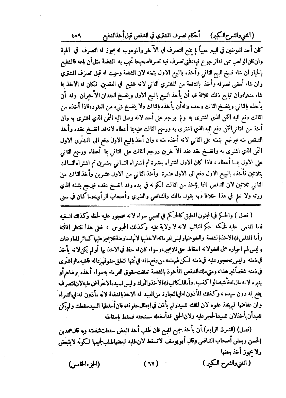(فصل) والحكم في المجنون المطبق كالحكم في الصبي سواء لأنه محجور عليه لحظه وكذلك السفيه فاما المغمى عليه فحكمه الغائب لان لا ولاية عليه وكذلك المحبوس، فعلى هذا ننتظر إفاقته وأما مفلس فله الأخذ بالشفعة والعفو عنها وليس لغرمائه الا خذ بها لأنها معاوضة فلا يجبر عليها كسائر المعاوضات وليس لهم إجباره على العفو لأنه إسقاط حق فلا يجبر، وسواء كان له حظ في الأخذ بها أو لم يكن لأنه يأخذ في ذمته وليس بمحجور عليه في ذمته لكن لهم منعه من دفع ماله في ثمنها لتعلق حقوقهم بماله فاشبه مالو إشترى في ذمته شقصاً غير هذا، ومتى ملك الشقص المأخوذ بالشفعة تعلقت حقوق الغرماء به سواء أخذه برضاهم أو بغيره لأنه مال له فأشبه مالوا كتسبه.