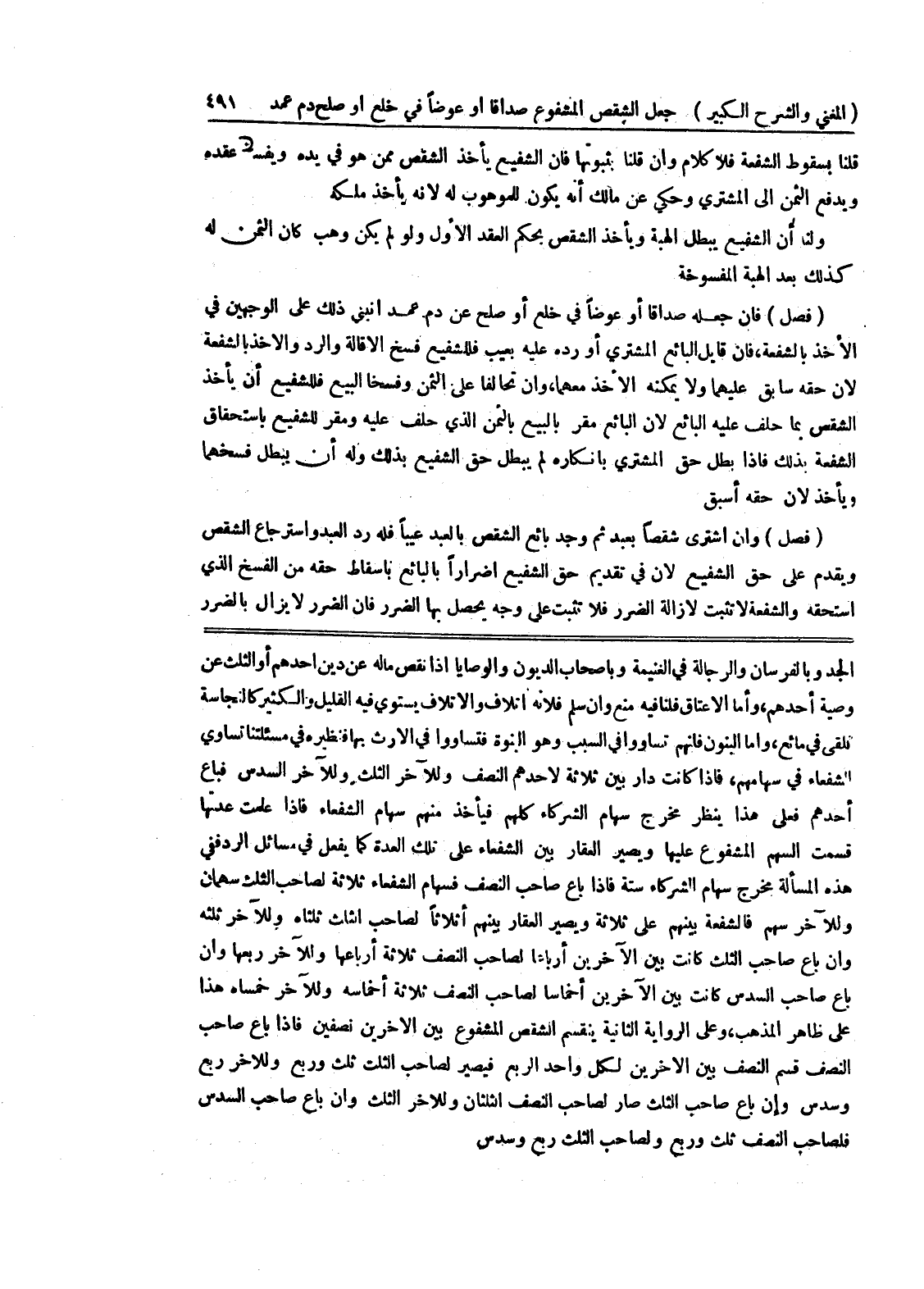 الجد وبالفرسان والرجالة في الغنيمة وبأصحاب الديون والوصايا إذا نقص ماله عن دين أحدهم أو الثلث عن وصية أحدهم، وأما الإعتاق فلنا فيه منع وإن سلم فلأنه إتلاف والإتلاف يستوي فيه القليل والكثير كالنجاسة تلقي في مائع، وأما البنون فإنهم تساووا في السبب وهو النبوة فتساووا في الإرث بها فنظيره في مسئلتنا تساوي الشفعاء في سهامهم، فإذا كانت دار بين ثلاثة لأحدهم النصف وللأخر الثلث وللآخر السدس فباع أحدهم فعلى هذا ينظر مخرج سهام الشركاء كلهم فيأخذ منهم سهام الشفعاء فإذا علمت عدتها قسمت السهم المشفوع عليها ويصير العقار بين الشفعاء على تلك العدة كما يفعل في مسائل الرد ففي هذه المسألة مخرج سهام الشركاء ستة فإذا باع صاحب النصف فسهام الشفعاء ثلاثة لصاحب الثلث سهمان وللآخر سهم فالشفعة بينهم على ثلاثة ويصير العقر بينهم أثلاثاً لصاحب الثلث ثلثاه وللآخر ثلثه وإن باع صاحب الثلث كانت بين الآخرين أرباعاً لصاحب النصف ثلاثة أرباعها وللآخر ربعها وإن باع صاحب السدس كانت بين الآخرين أخماساً لصاحب النصف ثلاثة أخماسه وللآخر خمساه هذا على ظاهر المذهب، وعلى الرواية الثانية ينقسم الشقص المشفوع بين الآخرين نصفين فإذا باع صاحب