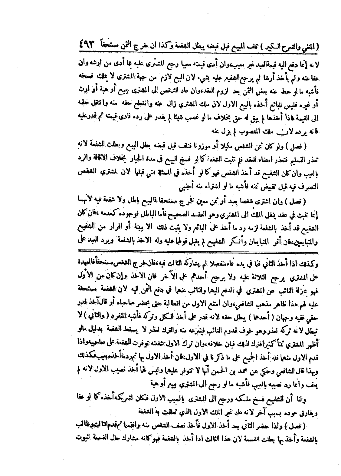 عليه لهم هذا ظاهر مذهب الشافعي، وإن امتنع الأول من المطالبة حتى يحضر صاحباه أو قال آخذ قدر حقي ففيه وجهان (أحدهما) يبطل حقه لأنه قدر على أخذ الكل وتركه فأشبه المفرد (والثاني) لا تبطل لأنه تركه لعذر وهو خوف قدوم الغائب فينزعه منه والترك لعذر لا يسقط الشفعة بدليل ما لو أظهر المشتري ثمناً كثيراً فترك لذلك فبان خلافه، وإن ترك الأول شفعته توفرت الشفعة على صاحبيه وإذا قدم الاول منهما فله أخذ الجميع على ما ذكرنا في الأول، فإن أخذ الأول بها ثم رد ما أخذه بعيب فكذلك وبهذا قال الشافعي وحكي عن محمد بن الحسن أنها لا تتوفر عليهما وليس لهما أخذ نصيب الأول لأنه لم يعف وإنما رد نصيبه بالعيب فأشبه مالو رجع إلى المشتري ببيع أو هبة ولنا أن الشفيع فسخ ملكه ورجع إلى المشتري بالسبب الأول فكان لشريكه أخذه كما لو عفا ويفارق عودة بسبب آخر لأنه عاد غير الملك الاول الذي تعلقت به الشفعة (فصل) وإذا حضر الثاني بعد أخذ الأول فأخذ نصف الشقص منه واقتسما ثم قدم الثالث وطالب بالشفعة وأخذ بها بطلت القسمة لأن هذا الثالث إذا أخذ بالشفعة فهو كأنه مشارك حال القسمة لثبوت