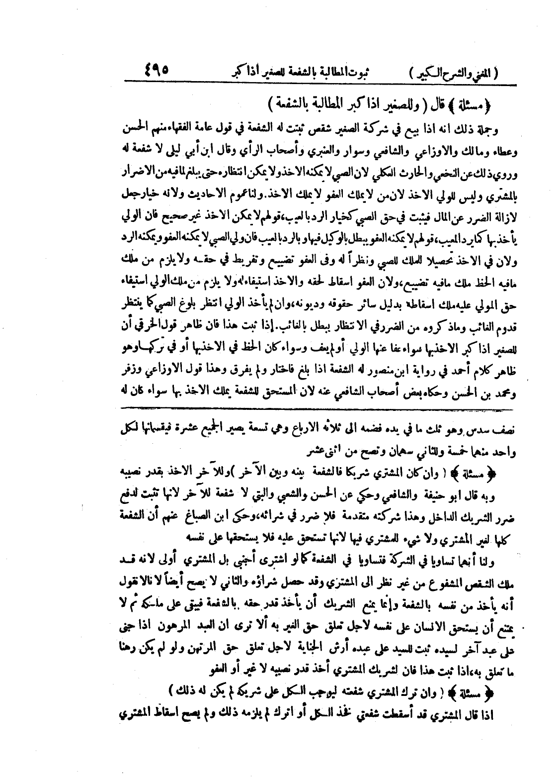 نصف سدس وهو ثلث في يده فضمنه إلى ثلاثة الأرباع وهي تسعة يصير الجميع عشرة فيقسمانها لكل واحد منهما خمسة وللثاني سهمان وتصح من اثني عشر (مسألة) (وإن كان المشتري شريكاً فالشفعة بينه وبين الآخر) وللآخر الأخذ بقدر نصيبه وبه قال أبو حنيفة والشافعي وحكي عن الحسن والشعبي والبتي لا شفعة للآخر لأنها تثبت لدفع ضرر الشريك الداخل وهذا شركته متقدمة فلا ضرر في شرائه، وحكي ابن الصباغ عنهم أن الشفعة كلها لغير المشتري ولا شئ للمشتري فيها لأنها تستحق عليه فلا يستحقها على نفسه ولنا أنهما تساويا في الشركة فتساويا في الشفعة كما لو اشترى أجنبي بل المشتري أولى لأنه قد ملك الشقص المشفوع من غير نظر إلى المشتري وقد حصل شراؤه والثاني لا يصح أيضا لا نالا نقول أنه يأخذ من نفسه بالشفعة وإنما يمنع الشريك أن يأخذ قدر حقه بالشفعة فيبقى على ملكه ثم لا يمتنع أن يستحق الإنسان على نفسه لأجل تعلق حق الغير به الا ترى أن العبد المرهون إذا جنى على عبد آخر لسيده ثبت للسيد على عبده أرش الجناية لأجل تعلق حق المرتهن ولو لم يكن رهناً ما تعلق به، إذا ثبت هذا فإن لشريك المشتري أخذ بقدر نصيبه لا غير أو العفو (مسألة) (وإن ترك المشتري شفعته ليوجب الكل على شريكه لم يكن له ذلك) إذا قال المشتري قد أسقطت شفعتي فخذ الكل أو أترك لم يلزمه ذلك ولم يصح إسقاط المشتري