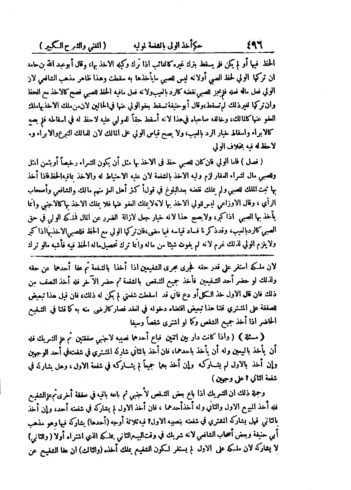 لأن ملكه إستقر على قدر حقه فجرى مجرى الشفيعين إذا أخذا بالشفعة ثم عفاأحدهما عن حقه ولذلك لو حضر أحد الشفيعين فأخذ جميع الشقص بالشفعة ثم حضر الآخر فله أخذ النصف من ذلك فإن قال الأول خذ الكل أودع فإني قد أسقطت شفعتي لم يكن له ذلك، فإن قيل هذا تبعيض للصفقة على المشتري قلنا هذا تبعيض اقتضاه دخوله في العقد فصار كالرضى منه به كما قلنا في الشفيع الحاضر إذا أخذ جميع الشقص وكما لو اشترى شقصاً وسيفاً (مسألة) (وإذا كانت دار بين اثنين فباع أحدهما نصيبه لأجنبي صفقتين ثم علم الشريك فله أن يأخذ بالبيعين وله أن يأخذ بأحدهما، فإن أخذ بالثاني شاركه المشتري في شفعته في أحد الوجهين وإن أخذ بالأول لم يشاركه وإن أخذ بهما جميعاً لم يشاركه في شفعة الأول، وهل يشاركه في شفعة الثاني؟ على وجهين) وجملة ذلك أن الشريك إذا باع بعض الشقص لاجنبي ثم باعه باقيه في صفقة أخرى ثم على الشفيع فله أخذ المبيع الأول والثاني وله أخذ أحدهما، فإن أخذ الأول لم يشاركه في شفعته أحد، وإن أخذ بالثاني فهل يشاركه المشتري في شفعته بنصيبه الأول؟ فيه ثلاثة أوجه (أحدها) يشاركه فيها وهو مذهب أبي حنيفة وبعض أصحاب الشافعي لأنه شريك في وقت البيع الثاني بملكه الذي إشتراه أولاً (والثاني) لا يشاركه لأن ملكه على الأول لم يستقر لكون الشفيع يملك أخذه (والثالث) إن عفا الشفيع عن