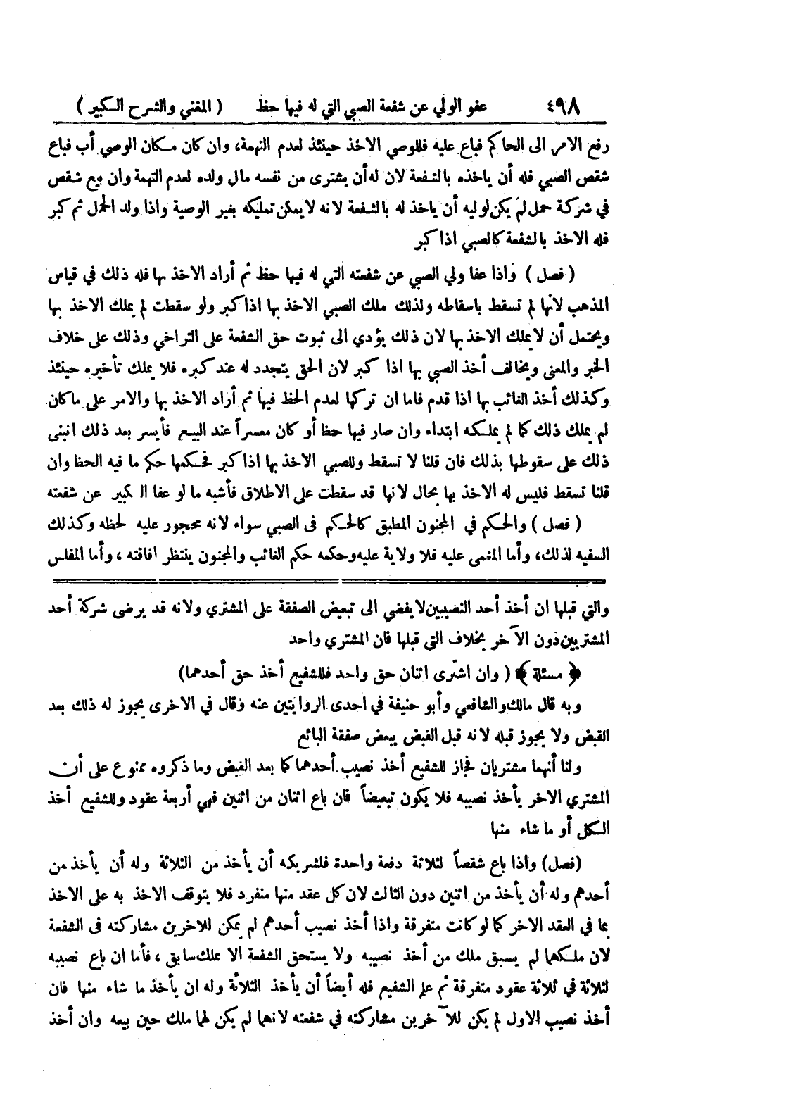 والتي قبلها أن أخذ أحد النصيبين لا يفضي إلى تبعيض الصفقة على المشتري ولأنه قد يرضى شركة أحد المشتريين دون الآخر بخلاف التي قبلها فإن المشتري واحد (مسألة) (وإن اشترى إثنان حق واحد فللشفيع أخذ حق أحدهما) وبه قال مالك والشافعي وأبو حنيفة في إحدى الروايتين عنه وقال في الأخرى يجوز له ذلك بعد القبض ولايجوز قبله لأنه قبل القبض يبعض صفقة البائع ولنا أنهما مشتريان فجاز للشفيع أخذ نصيب أحدهما كما بعد القبض وما ذكروه ممنوع على أن المشتري الآخر يأخذ نصيبه فلا يكون تبعيضاً فإن باع إثنان من إثنين فهي أربعة عقود وللشفيع أخذ الكل أو ما شاء منها (فصل) وإذا باع شقصاً لثلاثة دفعة واحدة فلشريكه أن يأخذ من الثلاثة وله أن يأخذ بمن أحدهم وله أن يأخذ من إثنين دون الثالث لأن كل عقد منها منفرد فلا يتوقف الأخذ به على الأخذ بما في العقد الآخر كما لو كانت متفرقة وإذا أخذ نصيب أحدهم لم يكن اللاخرين مشاركته في الشفعة لأن ملكهما لم يسبق ملك من أخذ نصيبه ولا يستحق الشفعة إلا بملك سابق، فأما إن باع نصيبه لثلاثة في ثلاثة عقود متفرقة ثم على الشفيع فله أيضاً أن يأخذ الثلاثة وله أن يأخذ ما شاء منها فإن أخذ نصيب الأول لم يكن للآخرين مشاركته في شفعته لأنهما لم يكن لهما ملك حين بيعه وإن أخذ