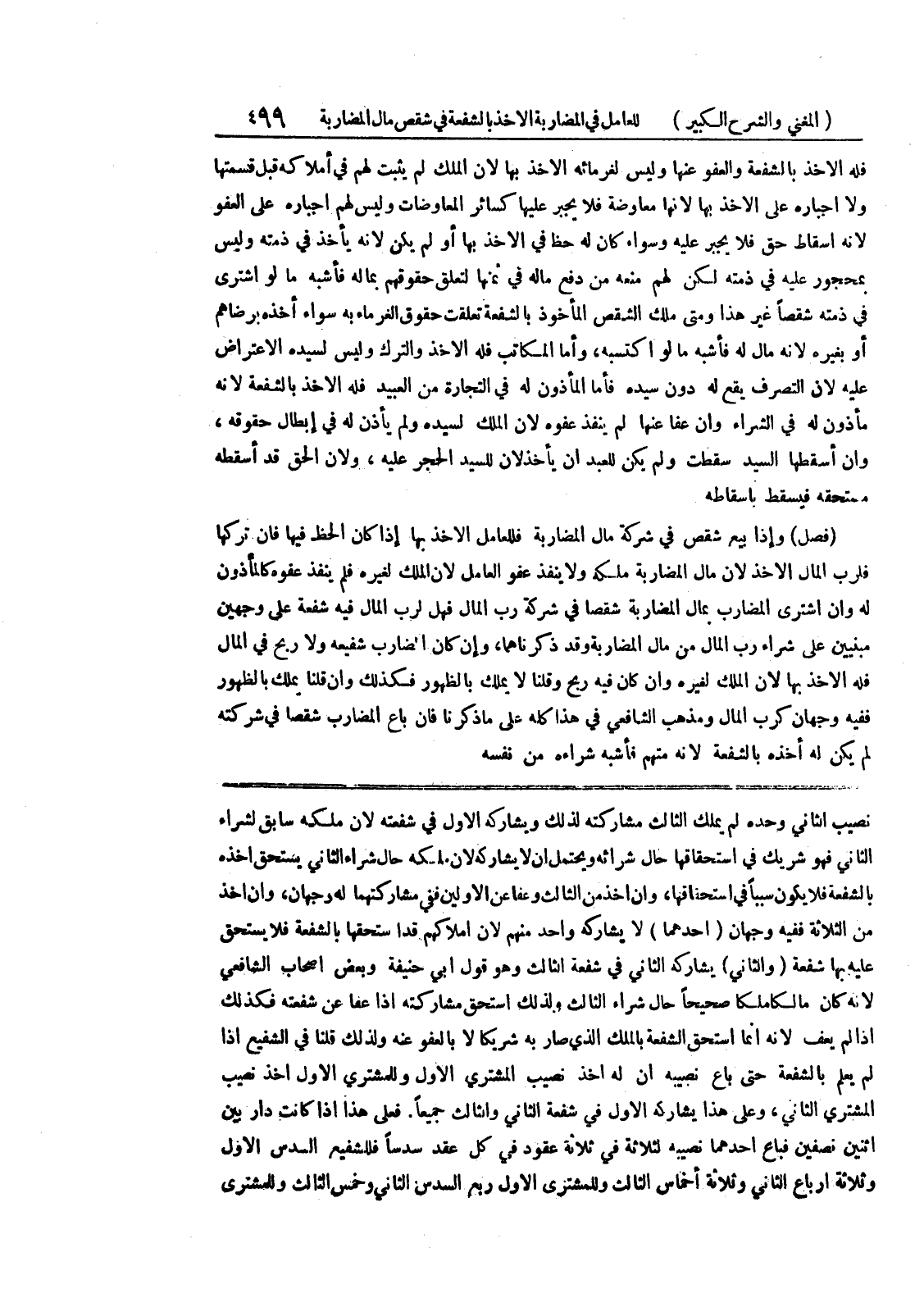 نصيب الثاني وحده لم يملك الثالث مشاركته لذلك ويشاركه الأول في شفعته لأن ملكه سابق لشراء الثاني فهو شريك في إستحقاقها حال شرائه ويحتمل أن لا يشاركه لأن ملكه حال شراء الثاني يستحق أخذه بالشفعة فلا يكون سبباً في إستحقاقها، وإن أخذ من الثالث وعفا عن الأولين ففي مشاركتهما له وجهان، وإن أخذ من الثلاثة ففيه وجهان (أحدهما) لا يشاركه واحد منهم لأن املاكهم قد استحقاقها بالشفعة فلا يستحق عليه بها شفعة (والثاني) يشاركه الثاني في شفعة الثالث وهو قول أبي حنيفة وبعض أصحاب الشافعي لأنه كان مالكا ملكا صحيحا شراء الثالث ولذلك إستحق مشاركته إذا عفا عن شفعته فكذلك اذالم يعف لا إنما إستحق الشفعة بالملك الذي صار به شريكاً لا بالعفو عنه ولذلك قلنا في الشفيع إذا لم يعلم بالشفعة حتى باع نصيبه إن له أخذ نصيب المشتري الأول وللمشتري الأول أخذ نصيب المشتري الثاني، وعلى هذا يشاركه الأول في شفعة الثاني والثالث جميعا.