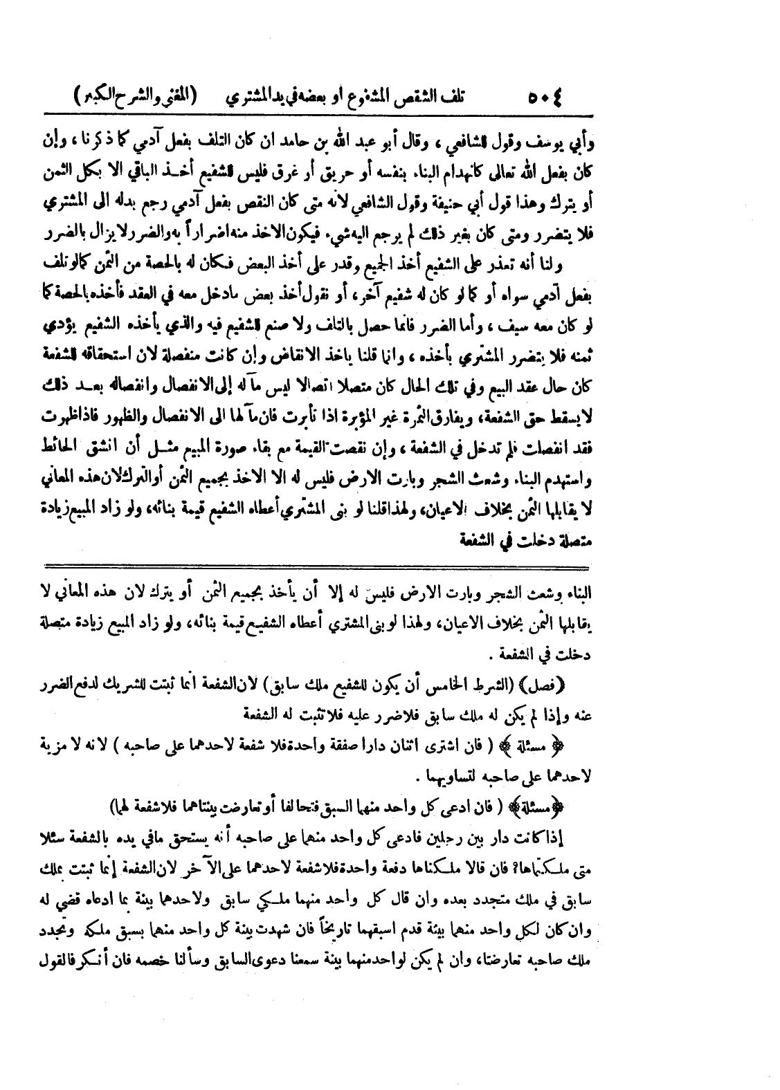 (فصل) (الشرط الخامس أن يكون للشفيع ملك سابق) لأن الشفعة إنما ثبتت للشريك لدفع الضرر عنه وإذا لم يكن له ملك سابق فلا ضرر عليه فلا تثبت له الشفعة (مسألة) (فإن اشترى إثنان دارا صفقة واحدة فلا شفعة لأحدهما على صاحبه) لأنه لا مزية لأحدهما على صاحبه لتساويهما.