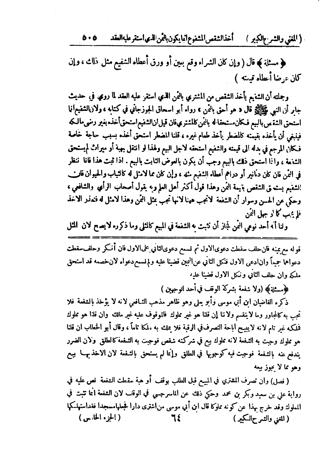 ذكره القاضيان ابن أبي موسى وأبو يعلى وهو ظاهر مذهب الشافعي لأنه لا يؤخذ بالشفعة فلا تجب به كالمجاور وما لا ينقسم ولأننا إن قلنا هو غير مملوك فالموقوف عليه غير مالك وإن قلنا هو مملوك فملكه غير تام لأنه لا يبيح إباحة التصرف في الرقبة فلا يملك به ملكاً تاماً، وقال أبو الخطاب إن قلنا هو مملوك وجبت به الشفعة لأنه مملوك بيع في شركته شقص فوجبت به الشفعة كالطلق ولأن الضرر يندفع عنه بالشفعة فوجبت فيه كوجوبها في الطلق وإنما لم يستحق بالشفعة لأن الأخذ بها بيع وهو مما لا يجوز بيعه (فصل) وإن تصرف المشتري في المبيع قبل الطلب بوقف أو هبة سقطت الشفعة نص عليه في رواية علي بن سعيد وبكر بن محمد وحكي ذلك عن الماسرجسي في الوقف لأن الشفعة إنما تثبت في المملوك وقد خرج بهذا عن كونه مملوكاً قال ابن أبي موسى من اشترى داراً فجعلها مسجداً فقد استهلكها