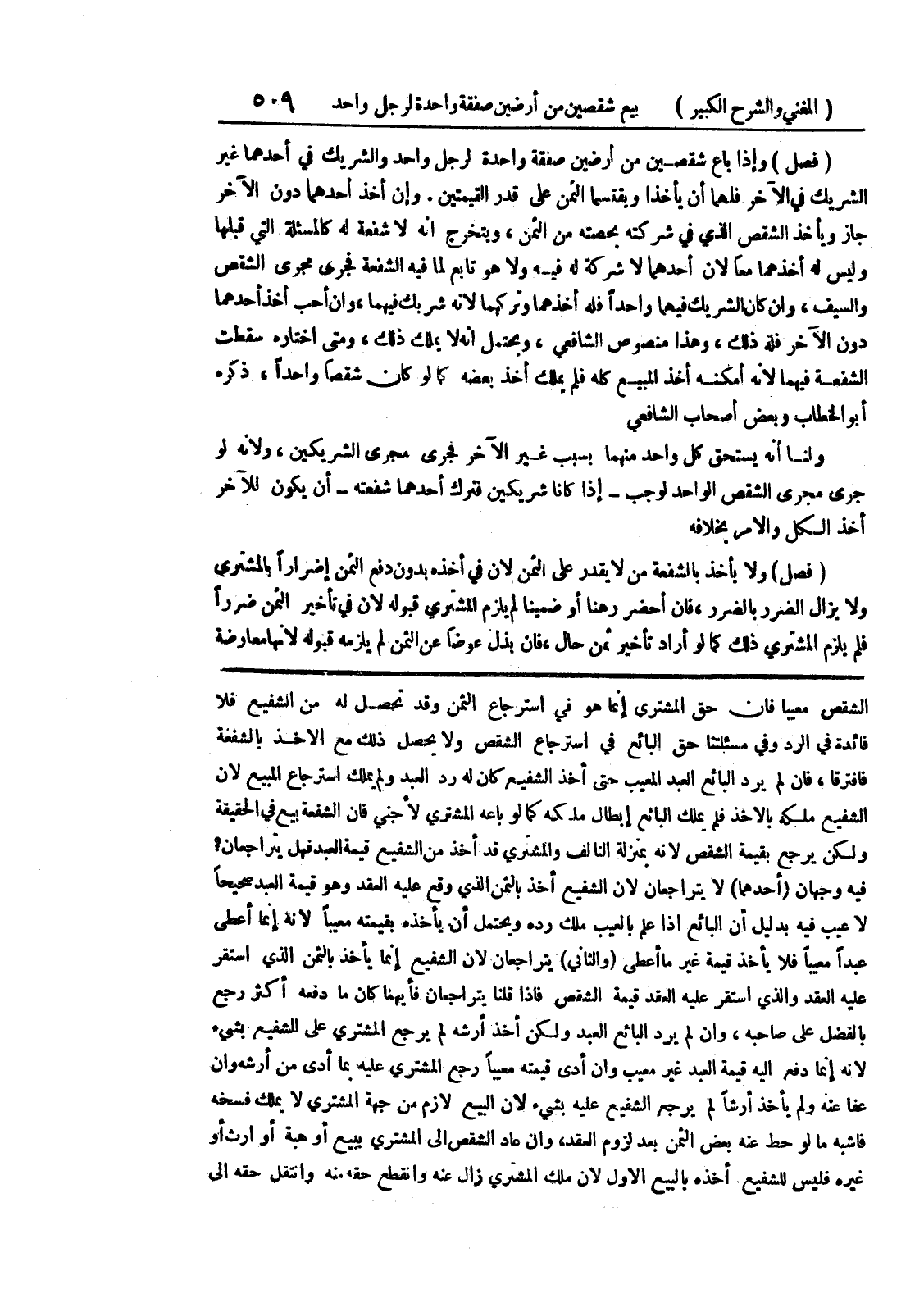 الشقص معيباً فإن حق المشتري إنما هو في استرجاع الثمن قد تحصل له من الشفيع فلا فائدة في الرد وفي مسئلتنا حق البائع في استرجاع الشقص ولا يحتمل ذلك مع الأخذ بالشعفة فافترقا، فإن لم يرد البائع العبد المعيب حتى أخذ الشفيع كان له رد العبد ولم يملك استرجاع المبيع لان الشفيع ملكب بالأخذ فلم يملك البائع إبطال ملكه كما لو باعه المشتري لاجني فإن الشفعة بيع في الحقيقة ولكن يرجع بقيمة الشقص لأنه بمنزلة التالف والمشتري قد أخذ من الشفيع قيمة العبد فهل يتراجعان؟ فيه وجهان (أحدهما) لا يتراجعان لأن الشفيع أخذ بالثمن الذي وقع عليه العقد وهو قيمة العبد صحيحا لاعيب فيه بدليل أن البائع إذا علم بالعيب ملك رده ويحتمل أن يأخذه بقيمته معيباً لأنه إنما أعطى عبداً معيباً فلا يأخذ قيمة غير ما أعطي (والثاني) يتراجعان لأن الشفيع إنما يأخذ بالثمن الذي استقر عليه العقد والذي استقر عليه العقد قيمة الشقص فإذا قلنا يتراجعان فأيهما كان ما دفعه أكثر رجع بالفضل على صاحبه، وإن لم يرد البائع العبدو لكن أخذ أرشه لم يرجع المشتري على الشفيع بشئ