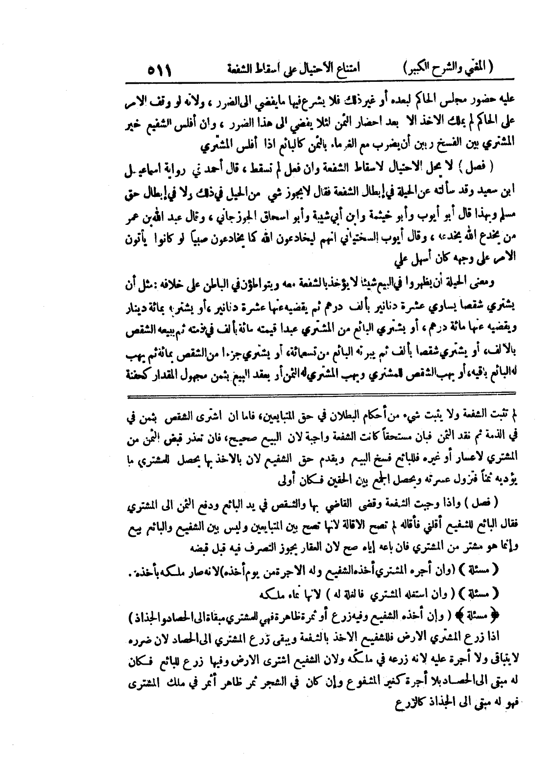 في الذمة ثم نقد الثمن فبان مستحقاً كانت الشفعة واجبة لأن البيع صحيح، فإن تعذر قبض الثمن من المشتري لإعسار أو غيره فللبائع فسخ البيع ويقدم حق الشفيع لأن بالأخذ بها يحصل للمشتري ما يؤديه ثمناً فتزول عسرته ويحصل الجمع بين الحقين فكان أولى (فصل) واذا وجبت الشفعة وقضى القاضي بها والشقص في يد البائع ودفع الثمن إلى المشتري فقال البائع للثفيع أقلني فأقاله لم تصح الإقالة لأنها تصح بين المتبايعين وليس بين الشفيع والبائع بيع وإنما هو مشتر من المشتري فإن باعه إياه صح لأن العقار يجوز التصرف فيه قبل قبضه (مسألة) (وإن أجره المشتري أخذه الشفيع وله الأجرة من يوم أخذه) لأنه صار ملكه بأخذه.