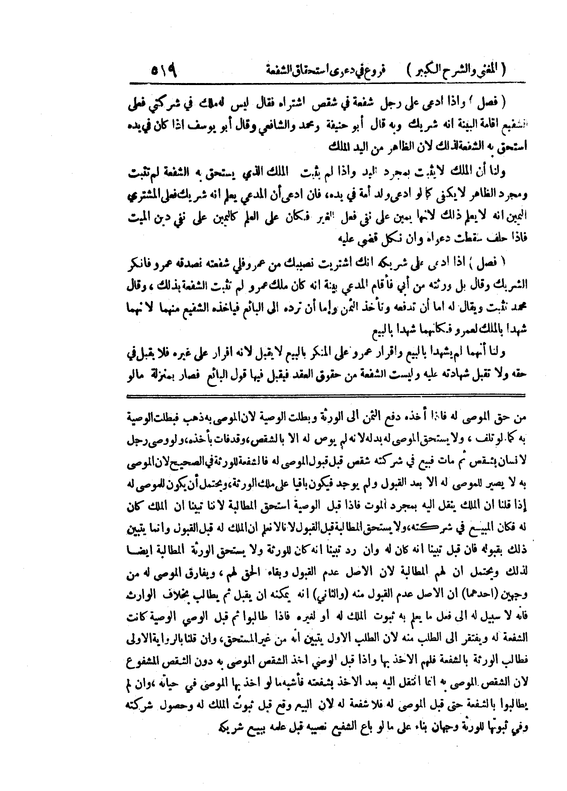 من حق الموصى له فإذا أخذه دفع الثمن إلى الورثة وبطلت الوصية لأن الموصى به ذهب فبطلت الوصية به كما لو تلف، ولا يستحق الموصى له بدله لأنه لم يوص له إلا بالشقص، وقد فات بأخذه، ولو وصى رجل لانسان بتقص ثم مات فبيع في شركته شقص قبل قبول الموصى له فالشفعة للورثة في الصحيح لأن الموصى به لا يصير للموصى له إلا بعد القبول ولم يوجد فيكون باقياً على ملك الورثة، ويحتمل أن يكون للموصى له إذا قلنا إن الملك ينقل إليه بمجرد الموت فإذا قبل الوصية استحق المطالبة لأننا تبينا أن الملك كان له فكان المبيع في شركته، ولا يستحق المطالبة قبل القبول لأنا لا نعلم أن الملك له قبل القبول لأنا لا نعلم أن الملك له قبل القبول وإنما يتبين ذلك بقبوله فإن قبل تبينا انه كانله وإن رد تبينا أنه كان للورثة ولا يستحق الورثة المطالبة أيضاً لذلك ويحتمل أن لهم المطالبة لأن الأصل عدم القبول وبقاء الحق لهم، ويفارق الموصى له من وجهين (أحدهما) أن الأصل عدم القبول منه (والثاني) أنه يمكنه أن يقبل ثم يطالب بخلاف الوارث فإنه لا سبيل له إلى فعل ما يعلم به ثبوت الملك له أو لغيره فإذا طالبوا ثم قبل الوصي الوصية كانت الشفعة له ويفتقر إلى الطلب منه لان الطلب الاول يتبين نه من غير المستحق، وإن قلنا بالرواية الأولى