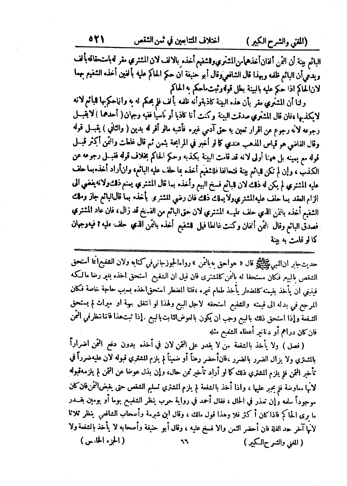 إذا ثبت هذا فإننا نتظر في الثمن فإن كان دراهم أو دنانير أعطاه الشفيع مثله (فصل) ولا يأخذ بالشفعة من لا يقدر على الثمن لأن في أخذه بدون دفع الثمن أضراراً بالمشتري ولا يزال الضرر بالضرر، فإن أحضر رهناً أو ضميناً لم يلزم المشتري قبوله لأن عليه ضرراً في تأخير الثمن فلم يلزم المشتري ذلك كما لو أراد تأخير ثمن حال، وإن بذل عوضاً عن الثمن لم يلزمه قبوله لأنها معاوضة فلم يجبر عليها، وإذا أخذ بالشفعة لم يلزم المشتري تسليم الشقص حتى يقبض الثمن فإن كان موجوداً سلمه وإن تعذر في الحال فقال أحمد في رواية حرب ينظر الشفيع يوماً أو يومين بقدر ما يرى الحاكم فإذا كان أكثر فلا وهذا قول مالك، وقال ابن شبرمة وأصحاب الشافعي نيظر ثلاثاً لأنها آخر حد القلة فإن أحضر الثمن والافسخ عليه، وقال أبو حنيفة وأصحاب لا يأخذ بالشفعة ولا