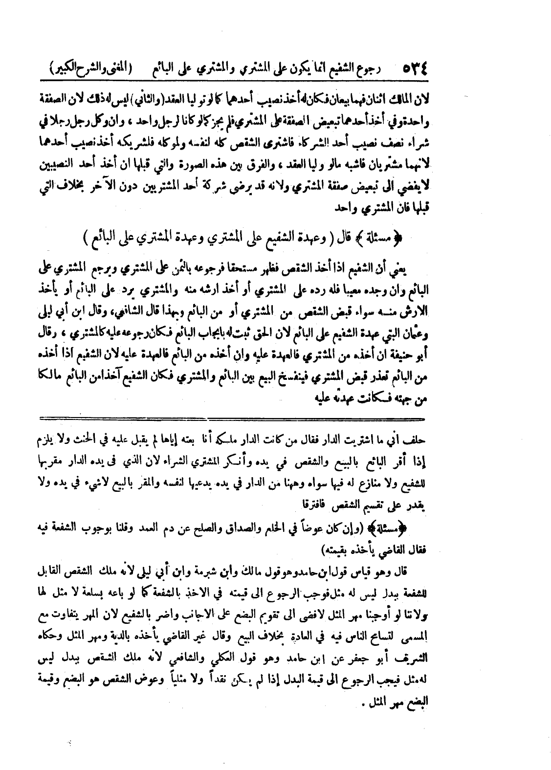 حلف أني ما اشتريت الدار فقال من كانت الدارملكه أنا بعته إياها لم يقبل عليه في الحنث ولا يلزم إذا أقر البائع بالبيع والشقص في يده وأنكر المشتري الشراء لأن الذي في يده الدار مقربها للشفيع ولا منازع له فيها سواه وههنا من الدار في يده يدعيها لنفسه والمقر بالبيع لا شئ في يده ولا يقدر على تقسيم الشقص فافترقا (مسألة) (وإن كان عوضاً في الخلع والصداق والصلح عن دم العمد وقلنا بوجوب الشفعة فيه فقال القاضي يأخذه بقيمته) قال وهو قياس قول ابن حامد وهو قول مالك وابن شبرمة وابن أبي ليلى لأنه ملك الشقص القابل للشفعة ببدل ليس له مثل فوجب الرجوع الى قيمته في الأخذ بالشفعة كما لو باعه بسلعة لامثل لها ولا ننا لو أوجبنا مهر المثل لا فضى إلى تقويم البضع على الأجانب وأضر بالشفيع لأن المهر يتفاوت مع المسمى لتسامح الناس فيه في العادة بخلاف البيع وقال غير القاضي يأخذه بالدية ومهر المثل وحكاه الشريف أبو جعفر عن ابن حامد وهو قول العكلي والشافعي لأنه ملك الشقص ببدل ليس له مثل فيجب الرجوع إلى قيمة البدل إذا لم يكن نقداً ولا مثلياً وعوض الشقص هو البضع وقيمة البضع مهر المثل.