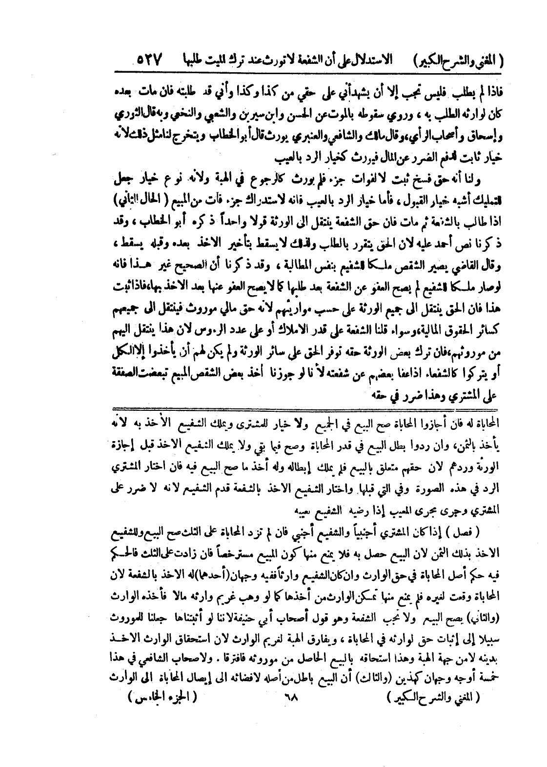 المحاباة له فإن أجازوا المحاباة صح البيع في الجميع ولا خيار للمشتري ويملك الشفيع الأخذ به لأنه يأخذ بالثمن، وإن ردوا بطل البيع في قدر المحاباة وصح فيما بقي ولا يملك الشفيع الأخذ قبل إجازة الورثة وردهم لأن حقهم متعلق بالبيع فلم يملك إبطاله وله أخذ ما صح البيع فيه فإن اختار المشتري الرد في هذه الصورة وفي التي قبلها واختار الشفيع الأخذ بالشفعة قدم الشفيع لأنه لا ضرر على المشتري وجرى مجرى المعيب إذا رضيه الشفيع بعيبه (فصل) إذا كان المشتري أجنبياً والشفيع أجنبي فن لم تزد المحاباة على الثلث صح البيع وللشفيع الأخذ بذلك الثمن لأن البيع حصل به فلا يمنع منها كون المبيع مسترخصاً فإن زادت على الثلث فالحكم فيه حكم أصل المحاباة في حق الوارث وإن كان الشفيع وارثًا ففيه وجهان (أحدهما) له الأخذ بالشفعة لأن المحاباة وقعت لغيره فلم يمنع منها تمكن الوارث من أخذها كما لو وهب غريم وارثه مالاً فأخذه الوارث (والثاني) يصح البيع ولا تجب الشفعة وهو قول أصحاب أبي حنيفة لأننا لو أثبتناها جعلنا للموروث سبيلاً إلى إثبات حق لوارثه في المحاباة، ويفارق الهبة لغريم الوارث لأن استحقاق الوارث الأخذ بدينه لامن جهة الهبة وهذا استحاقه بالبيع الحاصل من موروثه فافترقا.