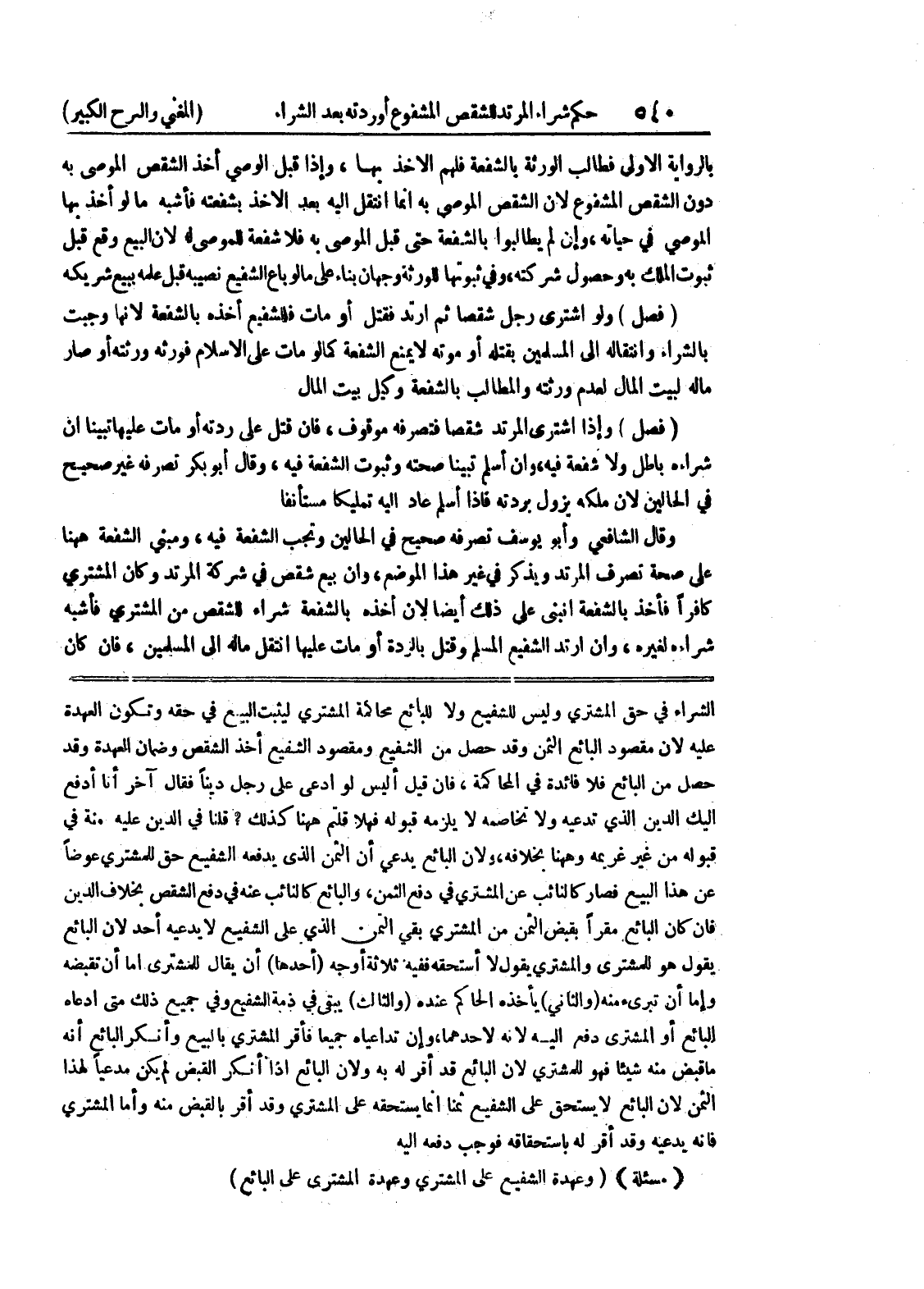 الشراء في حق المشتري وليس للشفيع ولا للبائع محاكمة المشتري ليثبت البيع في حقه وتكون العهدة عليه لأن مقصود البائع الثمن وقد حصل من الشفيع ومقصود الشفيع أخذ الشقص وضمان العهدة وقد حصل من البائع فلا فائدة في المحاكمة، فان قيل أليس لو ادعى على رجل ديناً فقال آخر أنا أدفع إليك الدين الذي تدعيه ولا تخاصمه لا يلزمه قبوله فهلا قلتم ههنا كذلك؟ قلنا في الدين عليه منة في قبوله من غير غريمه وههنا بخلافه، ولأن البائع يدعي أن الثمن الذي يدفعه الشفيع حق للمشتري عوضاً عن هذا البيع فصار كالنائب عن المشتري في دفع الثمن، والبائع كالنائب عنه في دفع الشقص بخلاف الدين فلن كان البائع مقرار بقبض الثمن من المشتري بقي الثمن الذي على الشفيع لا يدعيه أحد لأن البائع يقول هو للمشتري والمشتري يقول لا أستحقه ففيه ثلاثة أوجه (أحدها) أن يقال للمشتري إما أن تقبضه وإما أن تبرئ منه (والثاني) يأخذه الحاكم عنده (والثالث) يبقى في ذمة الشفيع وفي جميع ذلك متى ادعاه البائع أو المشتري دفع إليه لأنه لأحدهما، وإن تداعياء جميعاً فأقر المشتري بالبيع وأنكر البائع أنه ما قبض منه شيئاً فهو للمشتري لأن البائع قد أقر له به ولأن البائع إذ أنكر القبض لم يكن مدعياً لهذا الثمن لأن البائع لا يستحق علي الشفيع ثمنا إنما يستحقه على المشتري وقد أقر بالقبض منه وأما المشتري