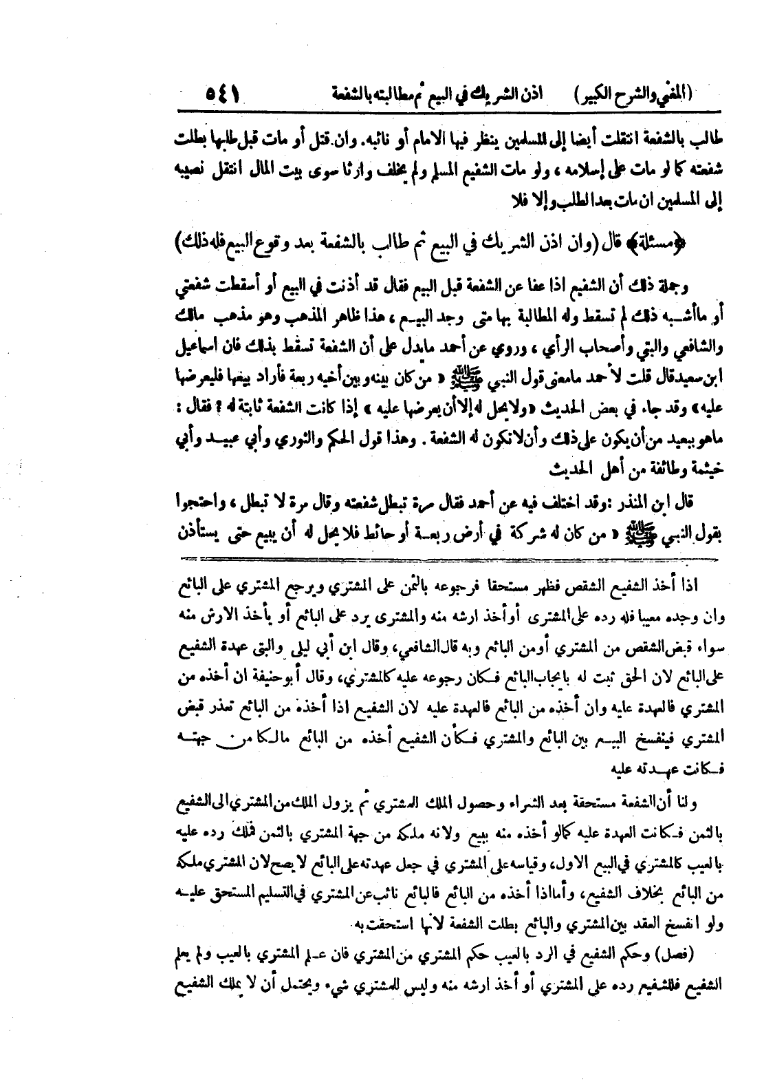 إذا أخذ الشفيع الشقص فظهر مستحقاً فرجوعه بالثمن على المشتري ويرجع المشتري على البائع وإن وجده معيباً فله رده على المشتري أو أخذ أرشه منه والمشتري يرد على البائع أو بأخذ الأرش منه سواء قبض الشقص من المشتري أو من البائع وبه قال الشافعي، وقال ابن أبي ليلى وتبقى عهدة الشفيع على البائع لأن الحق ثبت له بإيجاب البائع فكان رجوعه عليه كالمشتري، وقال أبو حنيفة إن أخذ، من المشتري فالعهدة عليه وإن أخذه من البائع فالعهدة عليه لأن الشفيع إذا أخذه من البائع تعذر قبض المشتري فينفسخ البيع بين البائع والمشتري فكأن الشفيع أخذه من البائع مالكاً من جهته فكانت عهدته عليه ولنا أن الشفعة مستحقة بعد الشراء وحصول الملك للمشتري ثم يزول الملك من المشتري إلى الشقص بالثمن فكانت العدة عليه كما لو أخذه منه ببيع ولأنه ملكه من جهة المشتري بالثمن فملك رده عليه بالعيب كالمشتري في البيع الأول، وقياسه على المشتري في جعل عهدته على البائع لا يصح لأن المشتري ملكه من البائع بخلاف الشفيع، وأما إذا أخذه من البائع فالبائع نائب عن المشتري في التسليم المستحق عليه ولو انفسخ العقد بين المشتري والبائع بطلت الشفعة لأنها استحقت به (فصل) وحكم الشفيع في الرد بالعيب حكم المشتري من المشتري فإن علم المشتري بالعيب ولم يعلم الشفى فللشفيع رده على المشتري أو أخذ أرشه منه وليس للمشترى شئ ويحتمل أن لا يملك الشفيع