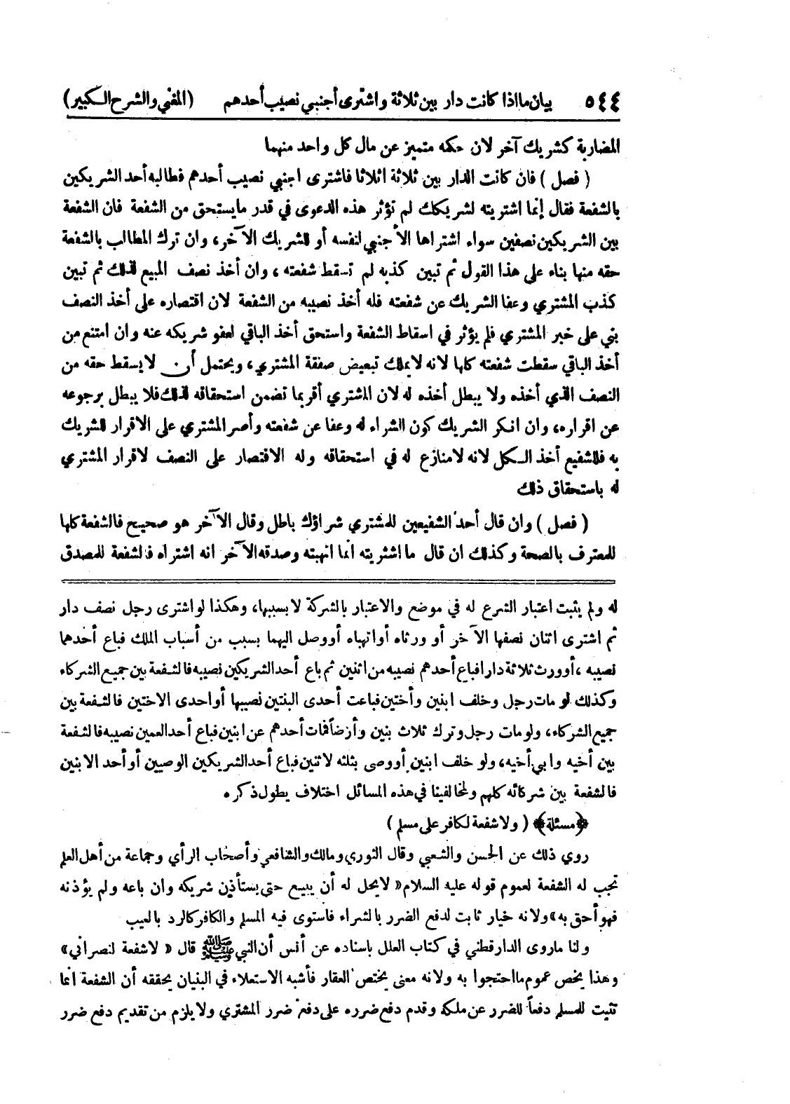 له ولم يثبت اعتبار الشرع له في موضع والإعتبار بالشركة لا بسببها وهكذا لو اشترى رجل نصف دار ثم اشترى إثنان نصفها الآخر أو ورثاه أو اتهباه أو وصل إليهما بسبب من أسباب الملك فباع أحدهما نصيبه، أو ورث ثلاثة دارا فباع أحدهم نصيبه من إثنين ثم باع أحد الشريكين نصيبه فالشفعة بين جميع الشركاء وكذلك لو مات رجل وخلف ابنين وأختين فباعت إحدى البنتين نصيبها أو إحدى الأختين فالشفعة بين جميع الشركاء، ولو مات رجل وترك ثلاث بنين وأرضاً فمات أحدهم عن ابنين فباع أحد العمين نصيبه فالشفعة بنى أخيه وابي أخيه، ولو خلف ابنين أو وصى بثلثه لا ثنين فباع أحد الشريكين الوصيين أو أحد الإبنين فالشفعة بين شركائه كلهم ولمخالفينا في هذه المسائل اختلاف يطول ذكره (مسألة) (ولا شفعة لكافر على مسلم) روى ذلك عن الحسن والشعبي ويقال الثوري ومالك والشافعي وأصحاب الرأي وجماعة من أهل العلم تجب له الشفعة لعموم قوله عليه السلام (لا يحل له أن يبيع حتى يستأذن شريكه وان باع ولم يؤذنه فهو أحق به) ولأنه خيار ثابت لدفع الضرر بالشراء فاستوى فيه المسلم والكافر كالرد بالعيب ولنا ما ورى الدارقطني في كتاب العلل بإسناده عن أنس أن النبي صلى الله عليه وسلم قال (لا شفعة لنصراني) وهذا يخص عموم ما احتجوا به ولأنه معنى يختص العقار فأشبه الإستعلاء في البنيان يحققه أن الشفعة إنما تثبت للمسلم دفعاً للضرر عن ملكه وقدم دفع ضرره على دفع ضرر المشتري ولا يلزم من تقديم دفع ضرر