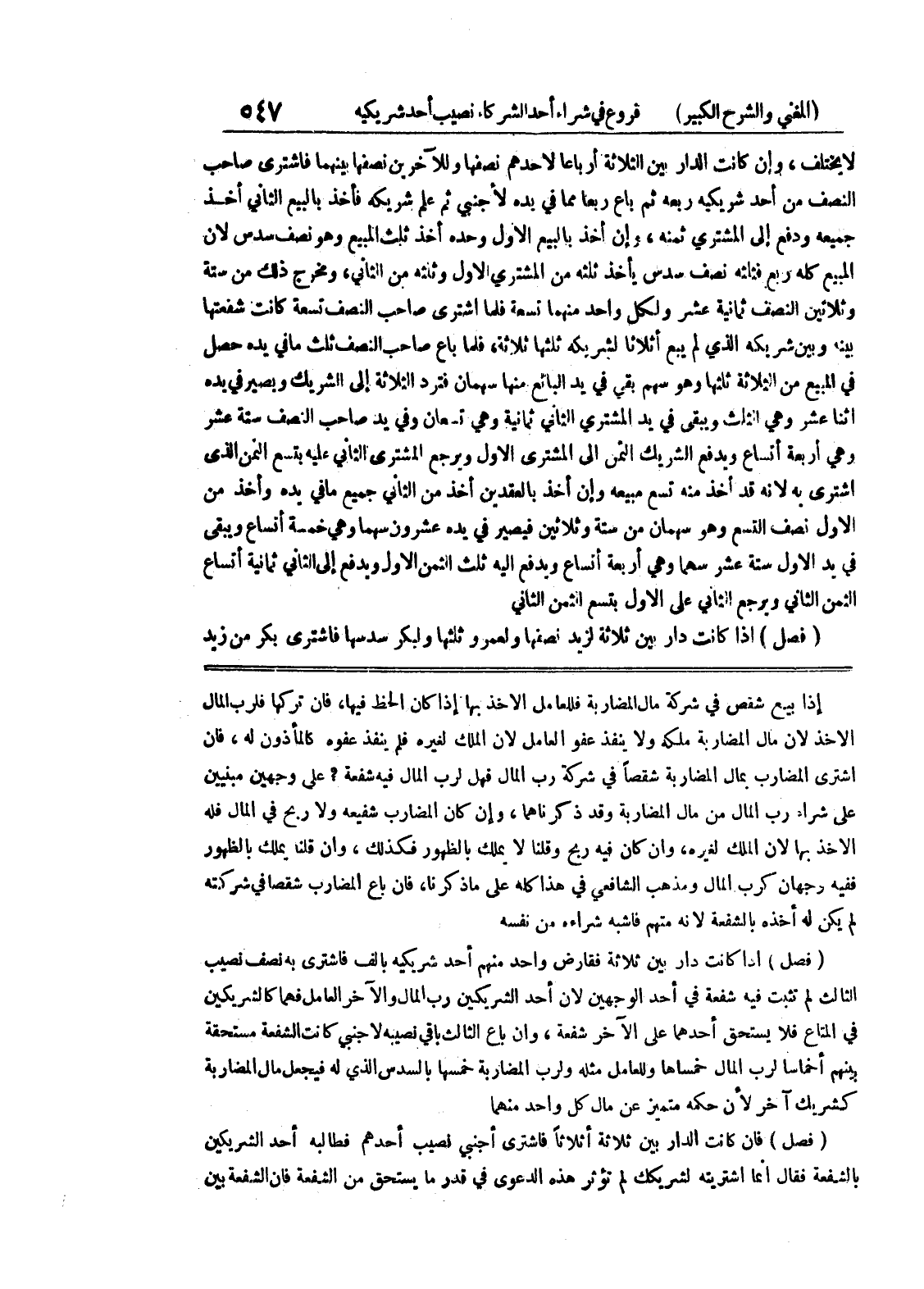 إذا بيع شقص في شركة مال المضاربة فللعامل الأخذ بها إذا كان الحظ فيها، فإن تركها فلرب المال الأخذ لأن مال المضاربة ملكه ولا ينفذ عفو العامل لأن الملك لغيره فلم ينفذ عفوه كالمأذون له، فإن اشترى المضارب بمال المضاربة شقصا في شركة رب المال فهل لرب المال فيه شفعة؟ على وجهين مبنيين على شراء رب المال من مال المضاربة وقد ذكرناهما، وإن كان المضارب شفيعة ولا ربح في المال فله الأخذ بها لأن الملك لغيره، وإن كان فيه ربح وقلنا لا يملك بالظهور فكذلك، وإن قلنا يملك بالظهور ففيه وجهان كرب المال ومذهب الشافعي في هذا كله على ما ذكرنا، فان باع المضارب شقصاً في شركته لم يكن له أخذه بالشفعة لأنه متهم فأشبه شراءه من نفسه (فصل) إذا كانت دار بين ثلاثة فقارض واحد منهم أحد شريكيه بألف فاشترى به نصف نصيب الثالث لم تثبت فيه شفعة في أحد الوجهين لأن أحد الشريكين رب المال والآخر العامل فهما كالشريكين في المتاع فلا يستحق أحدهما على الآخر شفعة، وإن باع الثالث باقي نصيبه لا جنبي كانت الشفعة مستحقة يبنهم أخماساً لرب المال خمساها وللعامل مثله ولرب المضاربة خمسها بالسدس الذي له فيجعل مال المضاربة كشريك آخر لأن حكمه متميز عن مال كل واحد منهما (فصل) فإن كانت الدار بين ثلاثة أثلاثا فاشترى أجنبي نصيب أحدهم فطالبه أحد الشريكين بالشفعة فقال إنما اشتريته لشريكك لم تؤثر هذه الدعوى في قدر ما يستحق من الشفعة فإن الشفعة بين