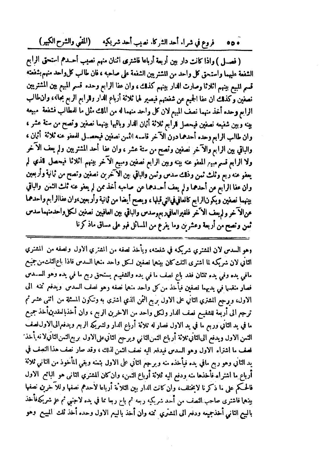 وهو السدس لأن المشتري شريكه في شفعته، ويأخذ نصفه من المشتري الأول ونصفه من المشتري الثاني لأن شريكه لما اشترى الثلث كان بينهما نصفين لكل واحد منهما السدس فإذا باع الثلث من جميع ما في يده وفي يده ثلثان فقد باع نصف ما في يده والشفيع يستحق ربع ما في يده وهو السدس فصار منقسما في يديهما نصفين فيأخذ من كل واحد منهما نصفه وهو نصف السدس ويدفع ثمنه إلى الأول ويرجع المشتري الثاني على الأول بربع الثمن الذي اشترى به وتكون المسألة من اثنى عشرثم ترجع إلى أربعة للشفيع نصف الدار ولكل واحد من الآخرين الربع، وإن أخذ بالعقدين أخذ جميع ما في يد الثاني وربع ما في يد الأول فصار له ثلاثة أرباع الدار ولشريكه الربع ويدفع الى الأول نصف الثمن الأول ويدفع إلى الثاني ثلاثة أربع الثمن الثاني ويرجع الثاني على الأول بربع الثمن الثاني لانه يأخذ الثمن الأول ويدفع إلى الثاني ثلاثة أرباع الثمن الثاني ويرجع الثاني على الأول بربع الثمن الثاني لأنه يأخذ نصف ما اشتراه الأول وهو اسدس فيدفع إليه نصف الثمن لذلك، وقد صار نصف هذا النصف في يد الثاني وهو ربع ما في يده فيأخذه منه ويرجع الثاني على الأول بثمنه وبقي المأخوذ من الثاني ثلاثة أرباع ما اشتراه فأخذها منه ودفع إليه ثلاثة أرباع الثمن، وإن كان المشتري الثاني هو البائع الأول فالحكم على ما ذكرنالا يختلف، وإن كانت الدار بين الثلاثة أرباعا لأحدهم نصفها وللآخرين نصفها بينهما فاشترى صاحب النصف من أحد شريكيه ربعه ثم باع ربعاً مما في يده لا جنبي ثم علم شريكه فأخذ بالبيع الثاني أخذ جميعه ودفع إلى المشتري ثمنه وإن أخذ بالبيع الأول وحده أخذ ثلث المبيع وهو