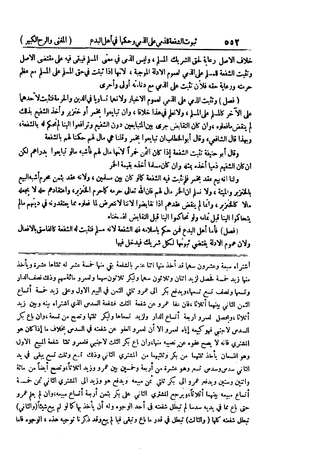 اشتراه سبعة وعشرون سهماً قد أخذ منها إثنا عشر بالشفعة بقي منها خمسة عشر له ثلثاها عشرة ويأخذ منها زيد خمسة فحصل لزيد إثنان وثلاثون سهما ولكبر ثلاثون سهما ولعمرو مائة سهم وذلك نصف الدار وتسعها ونصف تسع تسعها، ويدفع بكر إلى عمر وثلثي الثمن في البيع الأول وعلى زيد خمسة أتساع الثمن الثاني بينهما أثلاثاً، فإن عفا عمرو عن شفعة الثلث فشفعة السدس الذي اشتراه بينه وبين زيد