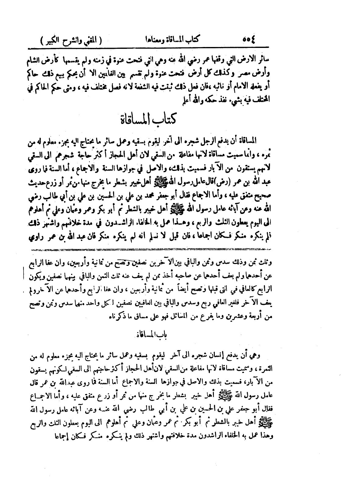 وثلث ثمن وذلك سدس وثمن والباقي بين الآخرين نصفين وتصح من ثمانية وأربعين، وإن عفا الرابع عن أحدهما ولم يعف أحدهما عن صاحبه أخذ ممن لم يعف عنه ثلث الثمن والباقي بينهما نصفين ويكون الرابع كالعافي في التي قبلها وتصح أيضاً من ثمانية وأربعين، وإن عفا الرابع وأحدهما عن الآخر ولم يعف الآخر فلغير العافي ربع وسدس والباقي بين العافيين نصفين لكل واحد منهما سدس وثمن وتصح من أربعة وعشرين وما يفرع من المسائل فهو على مساق ما ذكرناه باب المساقاة وهي أن يدفع إنسان شجرة إلى آخر ليقوم بسقيه وعمل سائر ما يحتاج إليه يجزء معلوم له من الثمرة، وسميت مساقاة لأنها مفاعلة من السقي لأن أهل الحجاز أكثر حاجتهم إلى السقي لكونهما يسقون من الآبار، فسميت بذلك والأصل في جوازها السنة والإجماع أما السنة فما روى عبد الله بن عمر قال عامل رسول الله صلى الله عليه وسلم أهل خيبر بشطر ما يخرج منها من ثمر أو زرع متفق عليه، وأما الإجماع فقال أبو جعفر علي بن الحسن بن علي بن أبي طالب رضي الله عنه وعن آبائه عامل رسول الله صلى الله عليه وسلم أهل خيبر بالشطر ثم أبو بكر ثم عمر وعثمان وعلي ثم أهلوهم إلى اليوم يعطون الثلث والربع وهذا عمل به الخلفاء الراشدون مدة خلافتهم واشتهر ذلك ولم ينكره منكر فكان إجماعاً