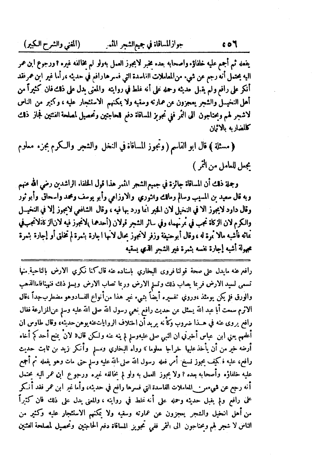 رافع عنه ما يدل على صحة قولنا فروى البخاري بإسناده عنه قال كنا نكري الأرض بالناحية منها تسمى لسيد الأرض فربما يصاب ذلك وتسلم الأرض وربما تصاب الأرض ويسلم ذلك فنهينا فأما الذهب والورق فلم يكن يومئذ، وروي تفسيره أيضا بشئ غير هذا من أنواع الفساد وهو مضطرب جداً، قال الأثرم سمعت أبا عبد الله يسئل عن حديث رافع نهى رسول الله صلى الله عليه وسلم عن المزارعة فقال رافع يروى عنه في هذا ضروب وكأنه يريد أن اختلاف الرويات عنه يوهن حديثه، وقال طاوس إن أعلمهم يعني ابن عباس أخبرني أن النبي صلى الله عليه وسلم لم ينه عنه ولكن قال (لأن يمنح أحدكم أخاه أرضه خير من أن يأخذ عليها خراجاً معلوماً) رواه البخاري ومسلم وأنكر زيد بن ثابت حديث رافع، عليه فكيف يجوز نسخ أمر فعله رسول الله صلى الله عليه وسلم حتى مات وهو يفعله ثم أجمع عليه خلفاؤه وأصحابه بعده؟ ولا يجوز العمل به ولو لم يخالفه غيره ورجوع ابن عمر إليه يحتمل أنه رجع عن شئ من المعاملات الفاسدة التي فسرها رافع في حديثه، وأما غير ابن عمر فقد أنكر