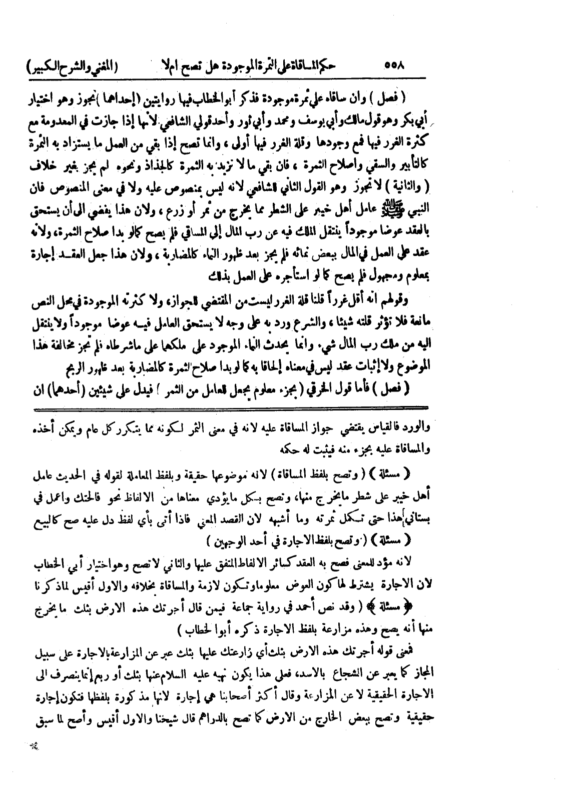بستاني هذا حتى تكمل ثمرته وما أشبهه لأن القصد المعني فإذا أتى بأي لفظ دل عليه صح كالبيع (مسألة) (وتصح بلفظ الإجارة في أحد الوجهين) لأنه مؤد للمعنى فصح به العقد كسائر الألفاظ المتفق عليها والثاني لا تصح وهو اختيار أبي الخطاب لأن الإجارة يشترط لها كون العوض معلوماً وتكون لازمه والمساقاة بخلافه والأول أقيس لما ذكرنا (مسألة) (وقد نص أحمد في رواية جماعة فيمن قال أجرتك هذه الأرض بثلث مايخرج منها أنه يصح وهذه مزارعة بلفظ الإجارة ذكره أبو الخطاب) فمعنى قوله أجرتك هذه الأرض بثلث أي زارعتك عليها بثلث عبر عن المزاعة بالإجارة على سبيل المجاز كما يعبر عن الشجاع بالأسد، فعلى هذا يكون نهيه عليه السلام عنها بثلث أو ربع إنما ينصرف إلى الإجارة الحقيقة لاعن المزارعة وقال أكثر أصحابنا هي إجارة لأنها مذكورة بلفظها فتكون إجارة حقيقة وتصح بعض الخارج من الأرض كما تصح بالدراهم قال شيخنا والأول أقيس وأصح لما سبق