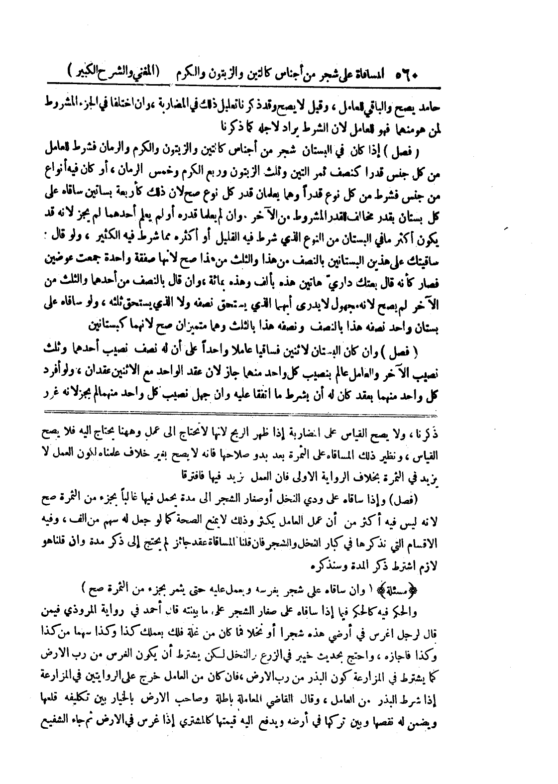 ذكرنا، ولا يصح القياس على المضاربة إذا ظهر الربح لأنها لا تحتاج إلى عمل وههنا يحتاج إليه فلا يصح القياس، ونظير ذلك المساقاة على الثمرة بعد بدو صلاحها فإنه لا يصح بغير خلاف علمناه لكون العمل لا يزيد في الثمرة بخلاف الرواية الأولى فإن العمل يزيد فيها فافترقا (فصل) وإذا ساقاه على ودي النخل أو صغار الشجر إلى مدة يحمل فيها غالباً بجزء من الثمرة صح لأنه ليس فيه أكثر من أن عمل العامل يكثر وذلك لا يمنع الصحة كما لو جعل له سهم من ألف، وفيه الأقسام التي نذكرها في كبار النخل والشجر فإن قلنا المساقاة عقد جائز لم يحتج إلى ذكر مدة وان قلناهو لازم اشترط ذكر المدة وسنذكره (مسألة) (وإن ساقاه على شجر بغرسه ويعمل عليه حتى يثمر بجزء من الثمرة صح) والحكم فيه كالحكم فيما إذا ساقاه على صغار الشجر على ما بينته قال أحمد في رواية المروذي فيمن قال لرجل اغرس في أرضي هذه شجراً أو نخلاً فما كان من غلة فلك بعملك كذا وكذا سهماً من كذا وكذا فأجازه، واحتج بحديث خيبر في الزرع والنخل لكن يشترط أن يكون الغرس من رب الأرض كما يشترط في المزارعة كون البذر من رب الأرض، فإن كان من العامل خرج على الروايتين في المزارعة إذا شرط البذر من العامل، وقال القاضي المعاملة باطلة وصاحب الأرض بالخيار بين تكليفه قلعها ويضمن له نقصها وبين تركها في أرضه ويدفع إليه قيمتها كالمشتري إذا غرس في الأرض ثم جاء الشفيع