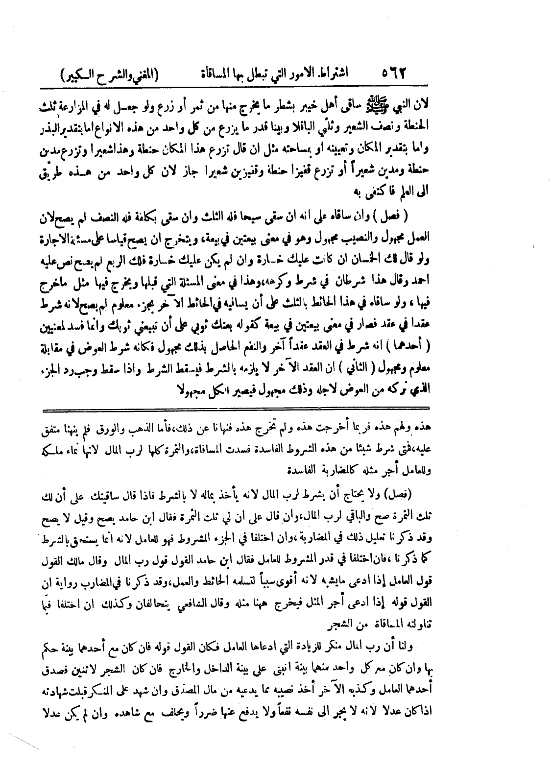 هذه ولهم هذه فربما أخرجت هذه ولم تخرج هذه فنهانا عن ذلك، فأما الذهب والورق فلم ينهنا متفق عليه، فمتى شرط شيئاً من هذه الشروط الفاسدة فسدت المسافاة، والثمرة كلها لرب المال لأنها نماء ملكه وللعامل أجر مثله كالمضاربة الفاسدة (فصل) ولا يحتاج أن يشرط لرب المال لأنه يأخذ بماله لا بالشرط فإذا قال ساقيتك على أن لك ثلث الثمرة صح والباقي لرب المال، وإن قال على أن لي ثلث الثمرة فقال ابن حامد يصح وقيل لا يصح وقد ذكرنا تعليل ذلك في المضاربة، وإن اختلفا في الجزء المشروط فهو للعامل لأنه إنما يستحق بالشرط كما ذكرنا، وفان اختلفا في قدر المشروط للعامل فقال ابن حامد القول قول رب المال وقال مالك القول قول العامل إذا ادعى ما يشبه لأنه أقوى سبباً لتسلمه الحائط والعمل، وقد ذكرنا في المضارب رواية أن القول قول إذا ادعى أجر المثل فيخرج ههنا مثله وقال الشافعي يتحالفان وكذلك إن اختلفا فيما تتاولته المساقاة من الشجر