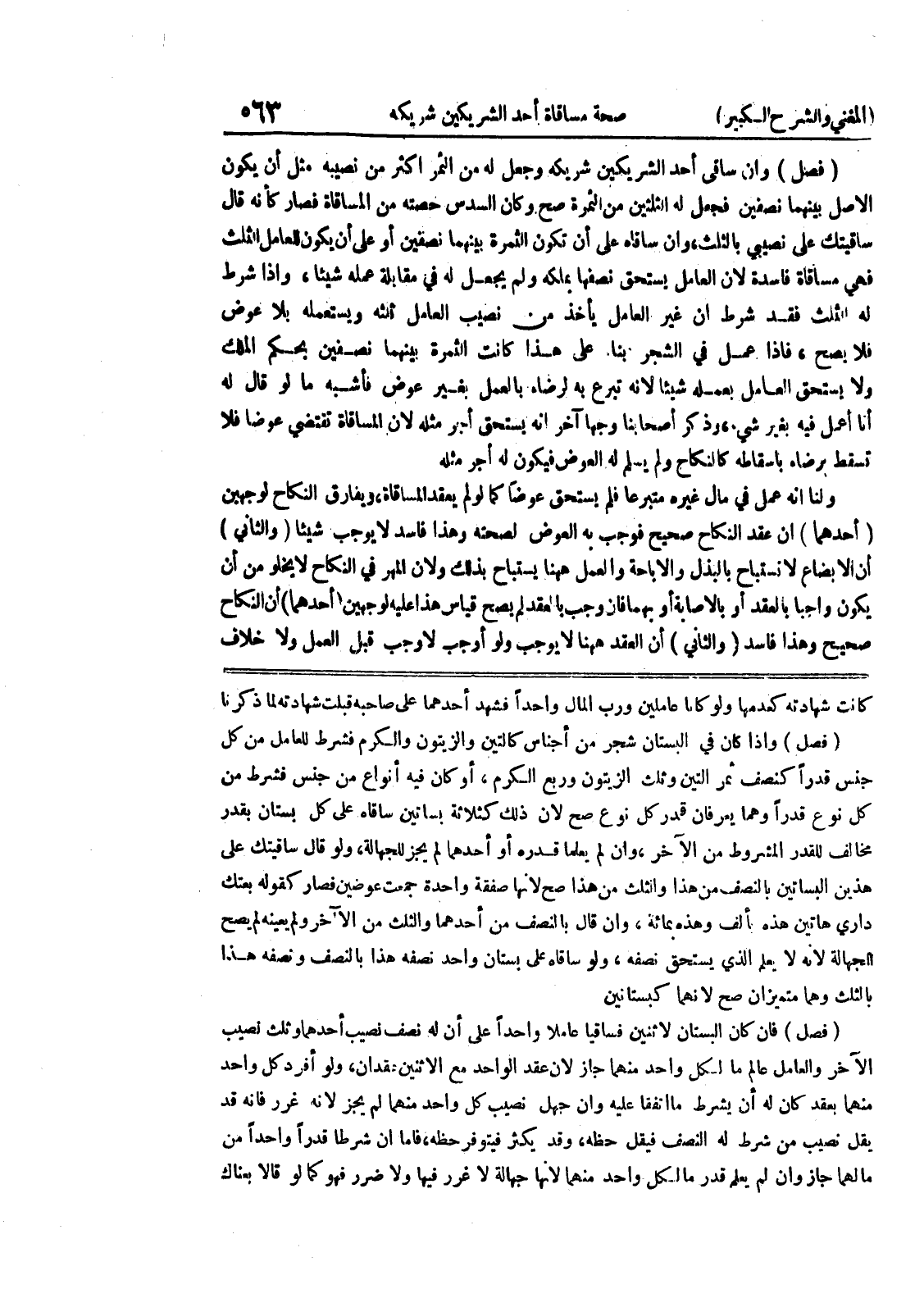 كانت شهادته كعدمه ولو كانا عاملين ورب المال واحداً فشهد أحدهما على صاحبه قبلت شهادته لما ذكرنا (فصل) وإذا كان في البستان شجر من أجناس كالتين والزيتون والكرم فشرط للعامل من كل جنس قدراً كنصف ثمر التين وثلث الزيتون وربع الكرم، أو كان فيه أنواع من جنس فشرط من كل نوع قدراً وهما يعرفان قدر كل نوع صح لأن ذلك كثلاثة بساتين ساقاة على كل بستان بقدر مخالف للقدر المشروط من الآخر، وإن لم يعلما قدره أو أحدهما لم يجز للجهالة، ولو قال ساقيتك على هذين البساتين بالنصف من هذا والثلث من هذا صح لأنها صفقة واحدة جمعت عوضين فصار كقوله بعتك داري هاتين هذه بألف وهذه بمائة، وإن قال بالنصف من أحدهما والثلث من الآخر ولم يعينه لم يصح الجهالة لأنه لا يعلم الذي يستحق نصفه، لو ساقاه على بستان واحد نصفه هذا بالنصف ونصفه هذا بالثلث وهما متميزان صح لأنهما كبستانين (فصل) فإن كان البستان لإثنين فساقيا عاملاً واحداً على أن له نصف نصيب أحدهما وثلث نصيب الآخر والعامل عامل ما لكل واحد منهما جاز لأن عقد الواحد مع الإثنين عقدان، ولو أفرد كل واحد منهما بعقد كان له أن يشرط ما اتفقا عليه وإن جهل نصيب كل واحد منهما لم يجز لأنه غرر فأنه قد يقل نصيب من شرط له النصف فيقل حظه، وقد يكثر فيتوفر حظه، فأما إن شرطا قدراً واحداً من مالهما جاز وإن لم يعلم قدر مالكل واحد منهما لأنها جهالة لا غرر فيها ولا ضرر فهو كا لو قالا بعناك