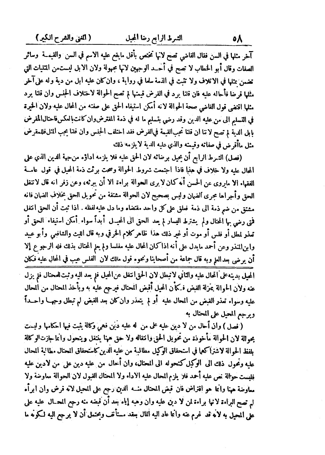 المحيل بدينه على المحال عليه والثاني لا تبطل لأن الحق انتقل عن المحيل فلم يعد إليه وثبت للمحتال فلم يزل عنه ولأن الحوالة بمنزلة القبض فكأن المحيل أقبض المحتال فيرجع عليه به ويأخذ المحتال من المحال عليه وسواء تعذر القبض من المحال عليه أو لم يتعذر وإن كان بعد القبض لم تبطل وجها واحداً ويرجع المحيل على المحتال به (فصل) وإن أحال من لادين عليه على من له عليه دين فهي وكالة يثبت فيها أحكامها وليست بحوالة لأن الحوالة مأخوذة من تحويل الحق وانتقاله ولا حق ههنا ينتقل ويتحول وإنما جازت الوكالة بلفظ الحوالة لاشتراكهما في استحقاق الوكيل مطالبة من عليه الدين كاستحقاق المحتال مطالبة المحال عليه وتحول ذلك إلى الوكيل كتحوله إلى المحتال، وإن أحال من عليه دين على من لا دين عليه فليست حوالة نص عليه أحمد فلا يلزم المحال عليه الأداء ولا المحتال القبول لأن الحوالة معاوضة ولا معاوضة ههنا وإنما هو اقتراض فإن قبض المحتال منه الدين رجع على المحيل لأنه قرض وإن أبرأه لم تصح البراءة لأنها براءة لمن لادين عليه وإن وهبه إياه بعد أن قبضه منه رجع المحال عليه على على المحيل به لأنه قد غرم عنه وإنما عاد إليه المال بعقد مستأنف ويحتمل أن لا يرجع إليه لكونه ما