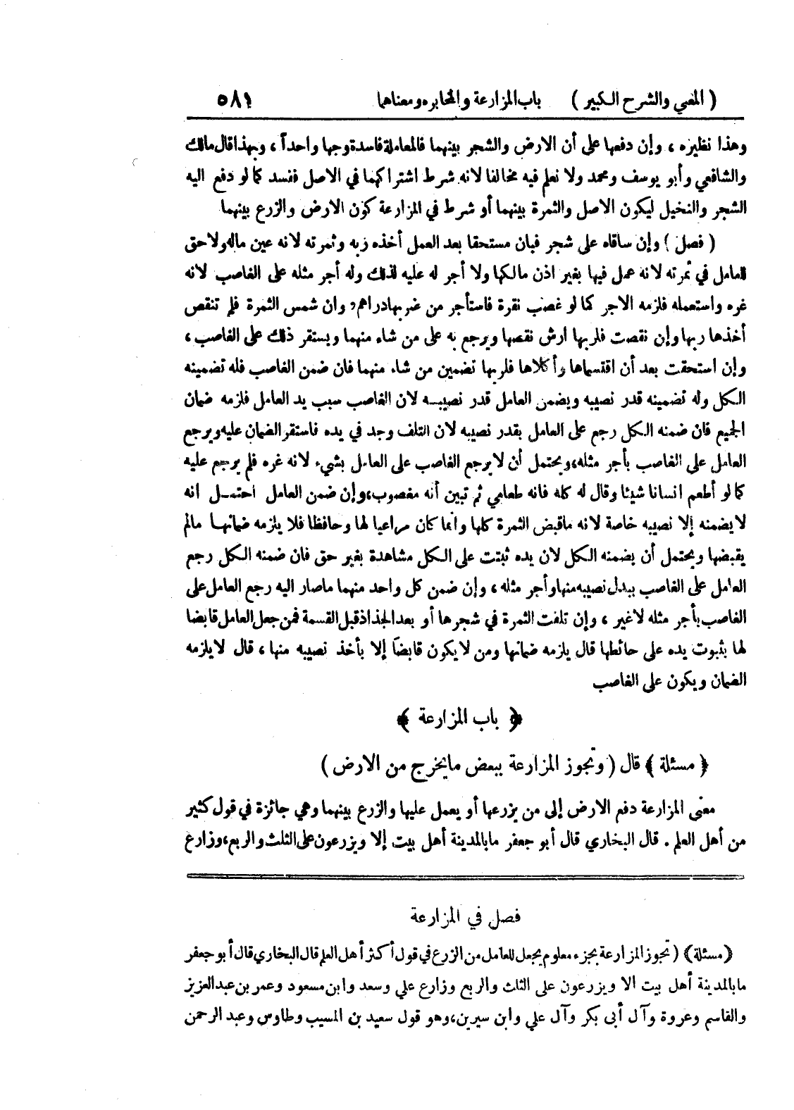 فصل في المزارعة (مسألة) (تجوز المزارعة بجزء معلوم يجعل للعامل من الزرع في قول أكثر أهل العلم قال البخاري قال أبو جعفر ما بالمدينة أهل بيت إلا ويزرعون على الثلث والربع وزارع علي وسعد وابن مسعود وعمر بن عبد العزيز والقاسم وعروة وآل أبي بكر وآل علي وابن سيرين، وهو قول سعيد بن المسيب وطاوس وعبد الرحمن