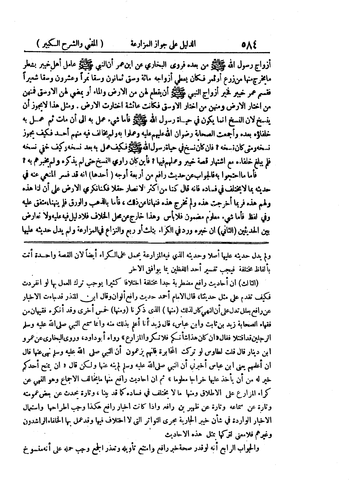 ولم يدل حديثه عليها أصلاً وحديثه الذي فيه المزارعة يحمل على الكراء أيضاً لأن القصة واحدة أتت بألفاظ مختلفة فيجب تفسير أحد اللفظين بما يوافق الآخر (الثالث) أن أحاديث رافع مضطربة جداً مختلفة اختلافاً كثيرا يوجب ترك العمل بها لو انفردت فكيف تقدم على مثل حديثنا، قال الامام أحمد حديث رافع ألوان وقال ابن المنذر قد جاءت الأخبار عن رافع بعلل تدل على أن النهي كان لذلك (منها) الذي ذكرنا (ومنها) خمس أخرى وقد أنكره فقيهان من فقهاء الصحابة زيد بن ثابت وابن عباس، قال زيد أنا أعلم بذلك منه وإنما سمع النبي صلى الله عليه وسلم الرجلين قد اقتتلا فقال (إن كان هذا شأنكم فلا تكرو المزارع) رواه أبو داود، وروي البخاري عن عمرو