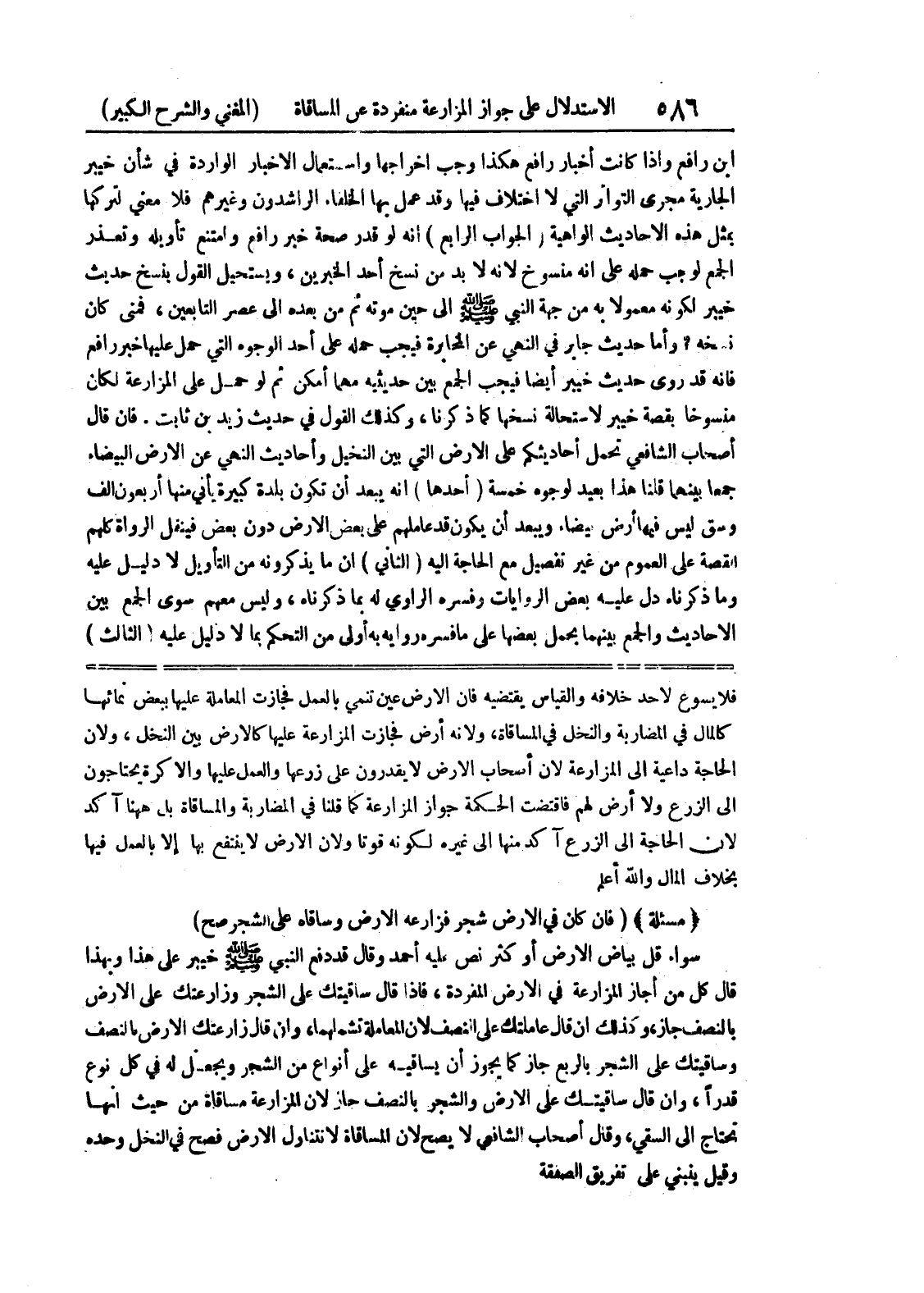 فلا يسوع لأحد خلافه والقياس يقتضيه فإن الأرض عين تنمى بالعمل فجازت المعاملة عليها ببعض نمائها كالمال في المضاربة والنخل في المساقاة، ولأنه أرض فجازت المزارعة عليها كالأرض بين النخل، ولأن الحاجة داعية إلى المزارعة لأن أصحاب الأرض لا يقدرون على زرعها والعمل عليها والأكرة يحتاجون إلى الزرع ولا أرض لهم فاقتضت الحكمة جواز المزارعة كما قلنا في المضاربة والمساقاة بل ههنا آكد لأن الحاجة إلى الزرع آكد منها إلى غيره لكونه قوتاً ولأن الأرض لا يفتفع بها إلا بالعمل فيها بخلاف المال والله أعلم (مسألة) (فان كان في الأرض شجر فزارعه الأرض وساقاه على الشجر صح) سواء قل بياض الأرض أو كثر نص عليه أحمد وقال قد دفع النبي صلى الله عليه وسلم خيبر على هذا وبهذا قال كل من أجاز المزارعة في الأرض المفردة، فإذا قال ساقيتك على الشجر وزارعتك على الأرض بالنصف جاز وكذلك إن قال عاملتك على النصف لأن المعاملة تشملهما، وإن قال زارعتك الأرض بالنصف وساقيتك على الشجر بالربع جاز كما يجوز أن يساقيه على أنواع من الشجر ويجعل له في كل نوع قدراً، وإن قال ساقيتك على الأرض والشجر بالنصف جاز لان المزارعة مساقاة من حيث إنها تحتاج الى السقي، وقال أصحاب الشافعي لا يصح لأن المساقاة لا نتناول الأرض فصح في النخل وحده وقيل ينبني على تفريق الصفقة