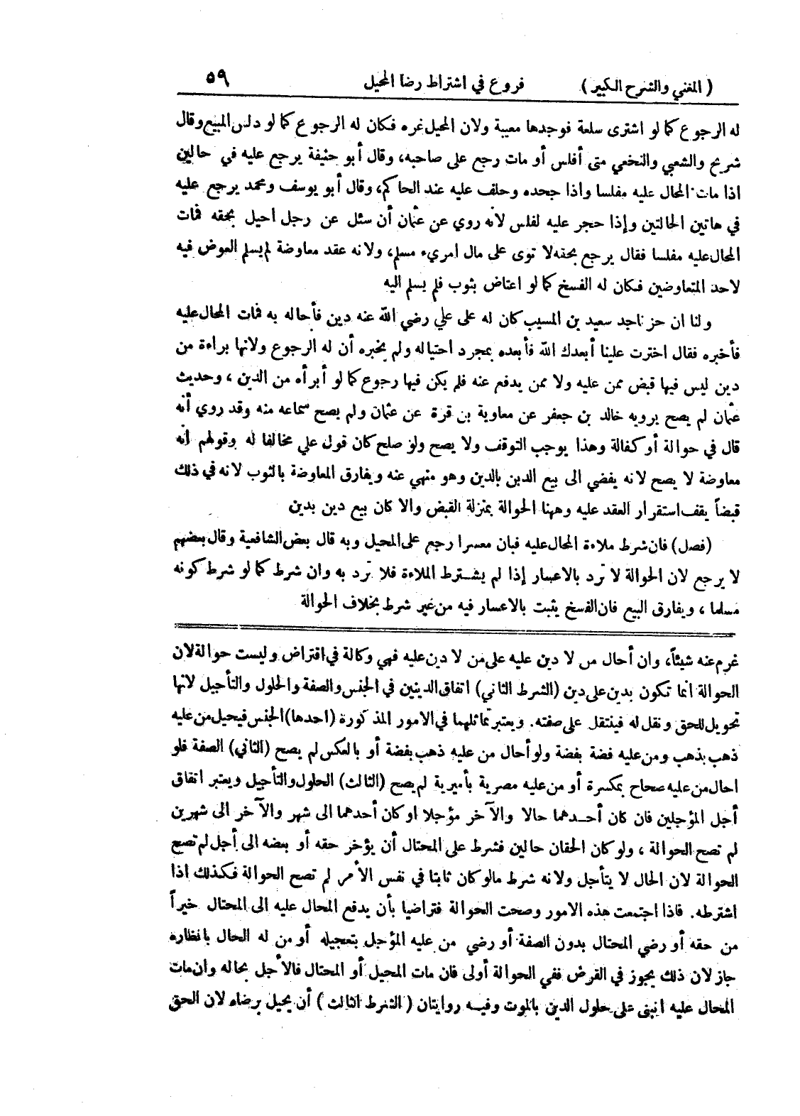 فإذا اجتمعت هذه الأمور وصحت الحوالة فتراضيا بأن يدفع المحال عليه إلى المحتال خيراً من حقه أو رضي المحتال بدون الصفة أو رضي من عليه المؤجل بتعجيله أو من له الحال بالظاره جاز لأن ذلك يجوز في القرض ففي الحوالة أولى فإن مات المحيل أو المحتال فالأجل بحال وإن مات المحال عليه انبنى على حول الدين بالموت وفيه روايتان (الشرط الثالث) ان يحيل برضاه لان الحق