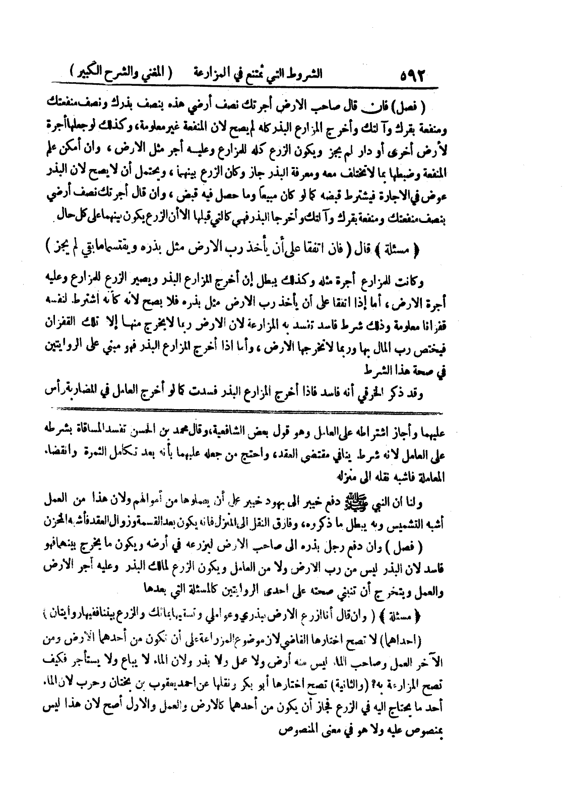 عليهما وأجاز إشتراطه على العامل وهو قول بعض الشافعية، وقال محمد بن الحسن تفسد المساقاة بشرطه على العامل لأنه شرط ينافي مقتضى العقد، وإحتج من جعله عليهما بأنه بعد تكامل الثمرة وإنقضاء المعاملة فأشبه نقله إلى منزلة ولنا أن النبي صلى الله عليه وسلم دفع خيبر إلى يهود خيبر على أن يعملوها من أموالهم ولأن هذا من العمل أشبه التشميس وبه يبطل ما ذكروه، وفارق النقل إلى المنزل فأنه يكون بعد القسمة وزوال العقد فأشبه المخزن (فصل) وإن دفع رجل بذره إلى صاحب الأرض ليرزعه في أرضه ويكون ما يخرج بينهما فهو فاسد لأن البذر ليس من رب الأرض ولا من العامل ويكون الزرع لمالك البذر وعليه أجر الأرض والعمل ويتخرج أن تنبني صحته على إحدى الروايتين كالمسألة التي بعدها (مسألة) وإن قال أنا أزرع الأرض بذري وعواملي وتسفيها بمائك والزرع بيننا ففيها روايتان (إحداهما) لا تصح إختارها القاضي لأن موضوع المزراعة على أن من تكون أحدهما اقترض من الآخر العمل وصاحب الماء ليس منه أرض ولا عمل بذر ولأن الماء لا يباع ولا يستأجر فكيف تصح المزارعة به؟ (والثانية) تصح اختارها أبو بكر ونقلها عن أحمد يعقوب بن بختان وحرب لأن الماء أحد ما يحتاج إليه في الزرع فجاز أن يكون من أحدهما كالأرض والعمل والأول أصح لأن هذا ليس بمنصوص عليه ولا هو في معنى المنصوص