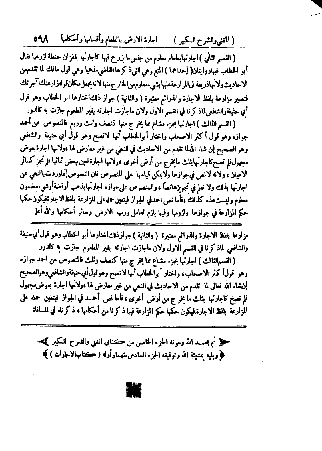 مزارعة بلفظ الإجارة والذرائع معتبرة (والثانية) جواز ذلك اختارها أبو الخطاب وهو قول أبي حنيفة والشافعي لما ذكرنا في القسم الأول ولأن ما جازت إجارته بغير المطعوم جازت به كالدور (القسم الثالث) إجارتها بجزء مشاع مما يخرج منها كنصف وثلث فالمنصوص عن أحمد جوازه وهو قول أكثر الأصحاب، واختار أبو الخطاب أنها لا تصح وهو قول أبي حنيفة والشافعي وهو الصحيح إن شاء الله تعالى لما تقدم من الأحاديث في النهي من غير معارض لها، ولأنها إجارة بعوض مجهول فلم تصح كإجارتها بثلث ما يخرج من أرض أخرى، فأما نص أحمد في الجواز فيتعين حمله على المزارعة بلفظ الإجارة فيكون حكمها حكم المزراعة فيما ذكرنا من أحكامها، ذكرناه في المساقاة (تم بحمد الله وعونه الجزء الخامس.