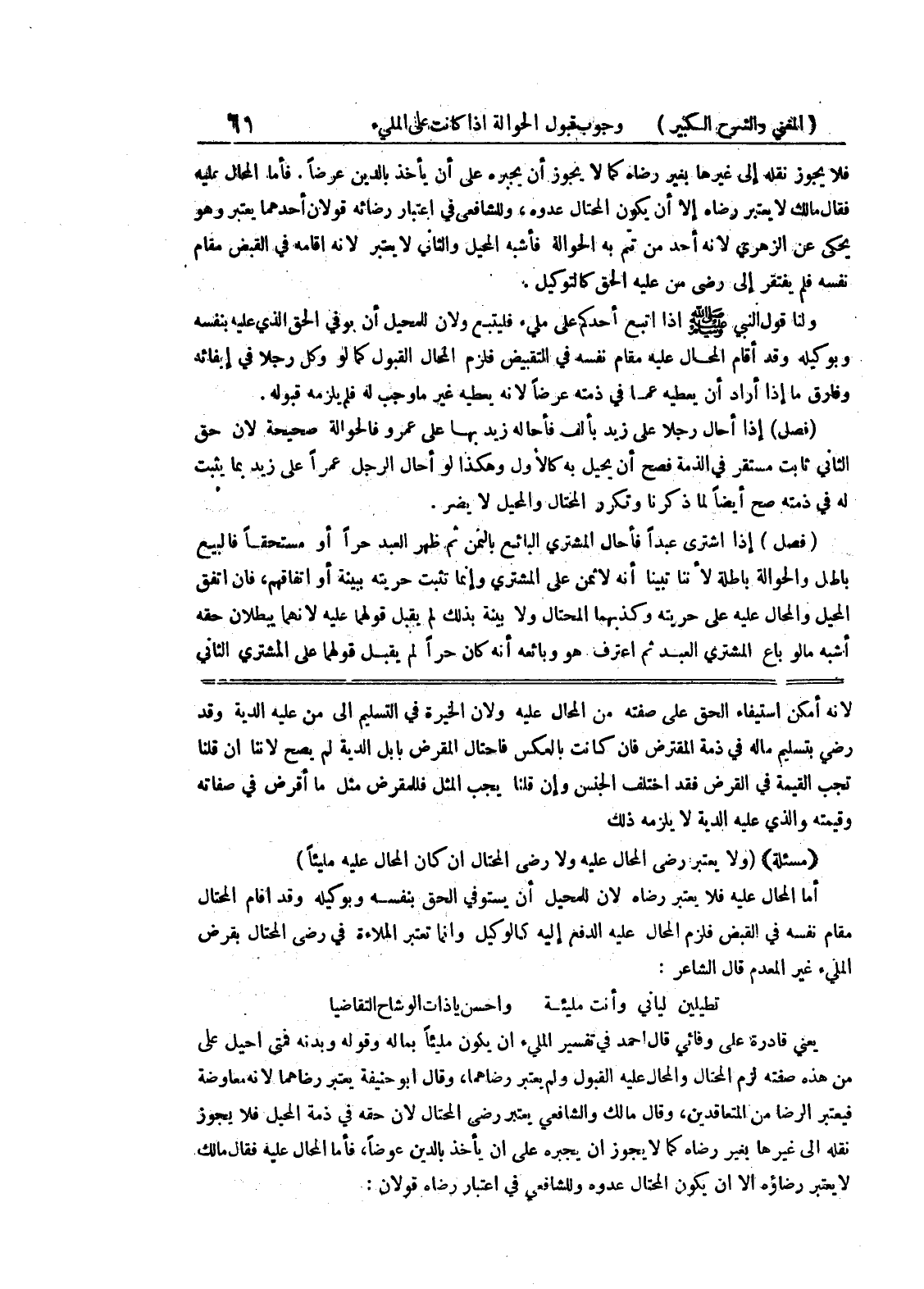 لأنه أمكن استيفاء الحق على صفته من المحال عليه ولأن الخيرة في التسليم إلى من عليه الدية وقد رضي بتسليم ماله في ذمة المقترض فإن كانت بالعكس فاحتال المقرض بابل الدية لم يصح لأننا إن قلنا تجب القيمة في القرض فقد اختلف الجنس وإن قلنا يجب المثل فللمقرض مثل ما أقرض في صفاته وقيمته والذي عليه الدية لا يلزمه ذلك (مسألة) (ولا يعتبر رضى المحال عليه ولارضى المحتال إن كان المحال عليه مليئا) أما المحال عليه فلا يعتبر رضاه لأن للمحيل أن يستوفي الحق بنفسه وبوكيله وقد افام المحتال مقام نفسه في القبض فلزم المحال عليه الدفع اليه كالوكيل وإنما تعتبر الملاءة في رضى المحتال بقرض الملئ غير المعدوم قال الشاعر: تطيلين لياني وأنت مليئة وأحسن يا ذات الوشاح التقاضيا يعني قادرة على وفائي قال أحمد في تفسير الملئ أن يكون مليئاً بماله وقوله وبدنه فمتى أحيل على من هذه صفته لزم المحتال والمحال عليه القبول ولم يعتبر رضاهما، وقال أبو حنيفة يعتبر رضاهما لأنه معاوضة فيعتبر الرضا من المتعاقدين، وقال مالك والشافعي يعتبر رضى المحتال لأن حقه في ذمة المحيل فلا يجوز نقله إلى غيرها بغير رضاه كما لا يجوز أن يجبره على أن يأخذ بالدين عوضاً، فأما المحال عليه فقال مالك لا يعتبر رضاؤه إلا أن يكون المحتال عدوه وللشافعي في اعتبار رضاه قولان:
