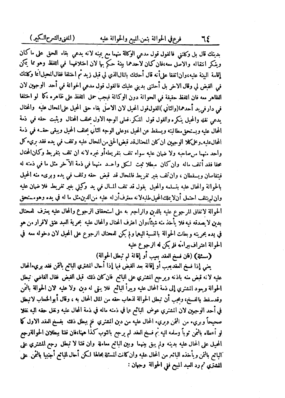 الحوالة لاتفاق المرجوع عليه بالدين والراجع به على استحقاق الرجوع والمحال عليه يعترف للمحتال بدين لا يصدقه فيه فلا يأخذ منه شيئاً، وإن اعترف المحتال والمحال عليه بحرية العبد عتق لإقرار من هو في يده بحريته وبطلت الحوالة بالنسبة إليهما ولم يكن للمحتال الرجوع على المحيل لأن دخوله معه في الحوالة اعتراف ببراءته فلم يكن له الرجوع عليه (مسألة) (فإن العقد بعيب أو إقالة لم تبطل الحوالة) يعني إذا فسخ العقد بعيب أو إقالة بعدا لقبض فيما إذا أحال المشتري البائع بالثمن فقد برئ المحال عليه لأنه قبض منه بإذنه ويرجع المشتري على البائع فإن كان ذلك قبل القبض فقال القاضي تبطل الحوالة ويعود المشتري إلى ذمة المحال عليه ويبرأ البائع فلا يبقى له دين ولا عليه لأن الحوالة بالثمن وقد سقط بالفسخ، ويجب أن تبطل الحوالة لذهاب حقه من المال المحال به، وقال أبو الخطاب لا تبطل في أحد الوجهين لأن المشتري عوض البائع عما في ذمته ماله في ذمة المحال عليه ونقل حقه اليه نقلا صحيحا وبرئ من الثمن ويرئ المحال عليه من دين المشتري فلم يبطل ذلك بفسخ العقد الأول كما لو أعطاه بالثمن ثوباً وسلمة اليه ثم فسخ العقد لم يرجع بالثوب كذا ههنا، فإن قلنا ببطلان الحوالة رجع المحيل على المحال عليه بدينه ولم يبق بينهما وبين البائع معاملة وإن قلنا لا تبطل رجع المشتري على البائع بالثمن ويأخذه البائع من المحال عليه وإن كانت المسألة بحالها لكن أحال البائع أجنبياً بالثمن على المشتري ثم رد البعد المبيع ففي الحوالة وجهان: